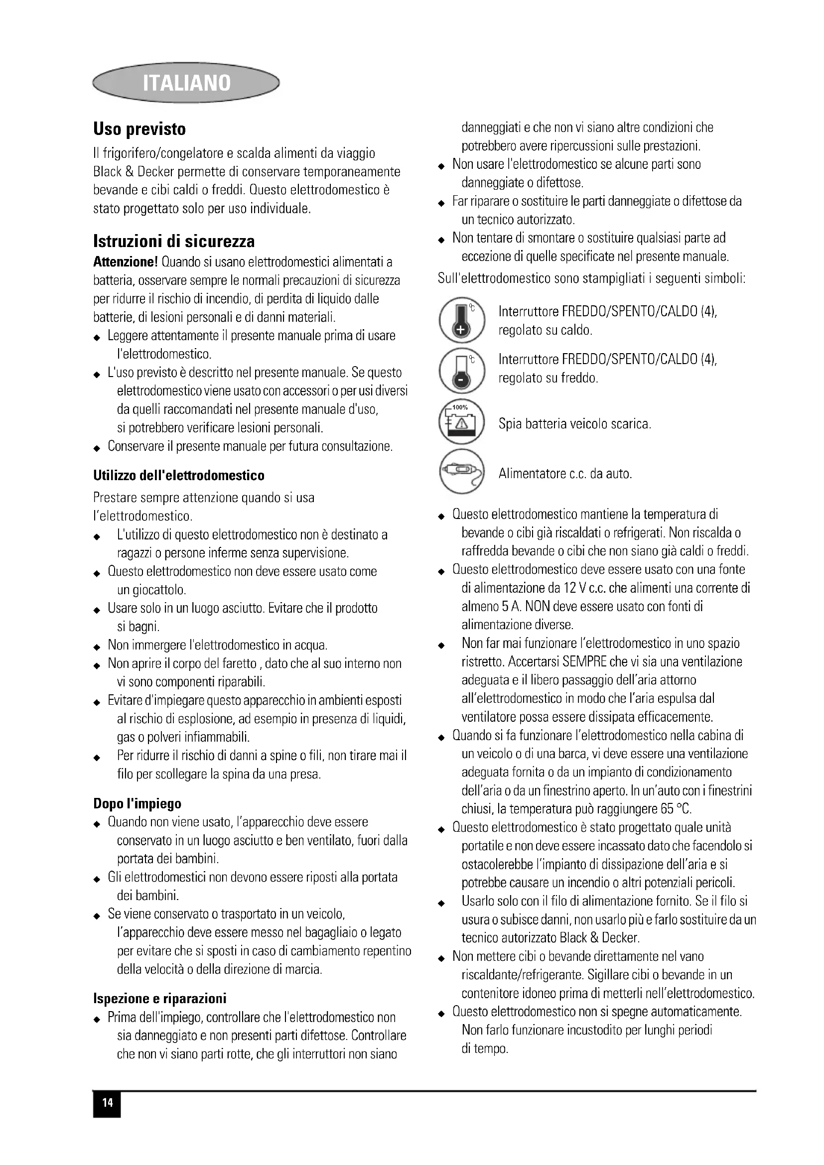 Il frigorifero/congelatore e scalda alimenti da viaggio Black & Decker permette di conservare temporaneamente bevande e cibi caldi o freddi. Questo elettrodomestico è stato progettato solo per uso individuale.