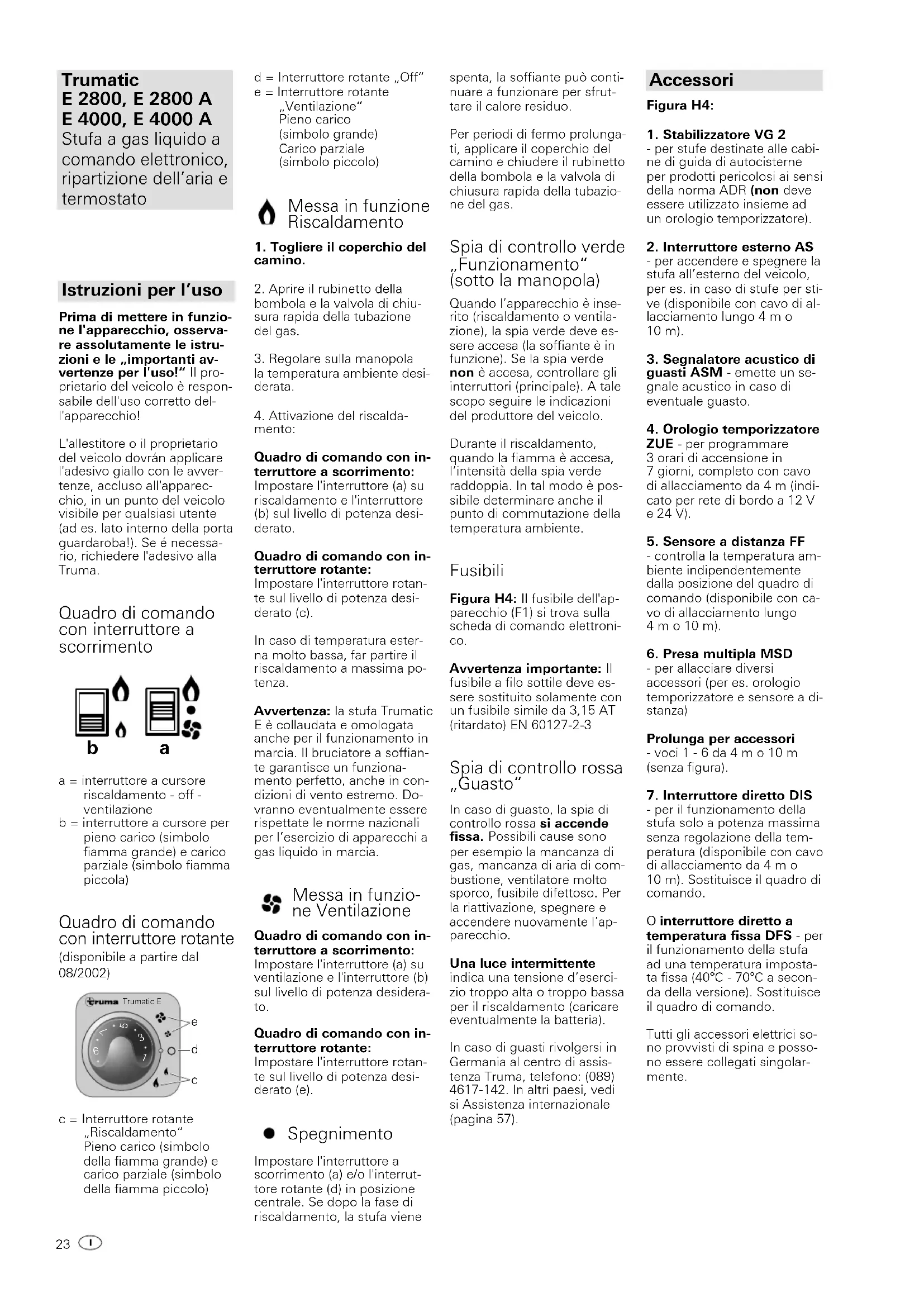 mento: Quadro di comando con in- terruttore a scorrimento: Impostare l'interruttore (a) su riscaldamento e l'interruttore (b) sul livello di potenza desi- derato. Quadro di comando con in- terruttore rotante: Impostare l'interruttore rotan- te sul livello di potenza desi- derato (c). In caso di temperatura ester- na molto bassa, far partire il riscaldamento a massima po- tenza. Avvertenza: la stufa Trumatic E è collaudata e omologata anche per il funzionamento in marcia. Il bruciatore a soffian- te garantisce un funziona- mento perfetto, anche in con- dizioni di vento estremo. Do- vranno eventualmente essere rispettate le norme nazionali per l’esercizio di apparecchi a gas liquido in marcia. Messa in funzio- ne Ventilazione Quadro di comando con in- terruttore a scorrimento: Impostare l'interruttore (a) su ventilazione e l'interruttore (b) sul livello di potenza desidera- to. Quadro di comando con in- terruttore rotante: Impostare l'interruttore rotan- te sul livello di potenza desi- derato (e). Spegnimento Impostare l'interruttore a scorrimento (a) e/o l'interrut- tore rotante (d) in posizione centrale. Se dopo la fase di riscaldamento, la stufa viene Istruzioni per l’uso Prima di mettere in funzio- ne l'apparecchio, osserva- re assolutamente le istru- zioni e le „importanti av- vertenze per l'uso!“ Il pro- prietario del veicolo è respon- sabile dell'uso corretto del- l'apparecchio! L'allestitore o il proprietario del veicolo dovrán applicare l'adesivo giallo con le avver- tenze, accluso all'apparec- chio, in un punto del veicolo visibile per qualsiasi utente (ad es. lato interno della porta guardaroba!). Se é necessa- rio, richiedere l'adesivo alla Truma. Quadro di comando con interruttore a scorrimento a = interruttore a cursore riscaldamento - off - ventilazione b = interruttore a cursore per pieno carico (simbolo fiamma grande) e carico parziale (simbolo fiamma piccola) Quadro di comando con interruttore rotante (disponibile a partire dal 08/2002) c = Interruttore rotante „Riscaldamento“ Pieno carico (simbolo della fiamma grande) e carico parziale (simbolo della fiamma piccolo) Trumatic E