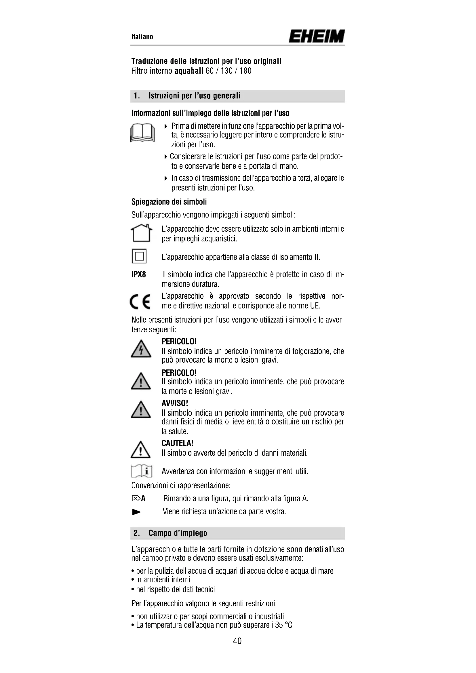 Informazioni sull’impiego delle istruzioni per l’uso 4 Prima di mettere in funzione l’apparecchio per la prima vol- ta, è necessario leggere per intero e comprendere le istru- zioni per l’uso. 4 Considerare le istruzioni per l’uso come parte del prodot- to e conservarle bene e a portata di mano. 4 In caso di trasmissione dell’apparecchio a terzi, allegare le presenti istruzioni per l’uso. Spiegazione dei simboli Sull’apparecchio vengono impiegati i seguenti simboli: L’apparecchio deve essere utilizzato solo in ambienti interni e per impieghi acquaristici. L’apparecchio appartiene alla classe di isolamento II. IPX8 Il simbolo indica che l’apparecchio è protetto in caso di im- mersione duratura. L’apparecchio è approvato secondo le rispettive nor- me e direttive nazionali e corrisponde alle norme UE. Nelle presenti istruzioni per l’uso vengono utilizzati i simboli e le avver- tenze seguenti: PERICOLO! Il simbolo indica un pericolo imminente di folgorazione, che può provocare la morte o lesioni gravi. PERICOLO! Il simbolo indica un pericolo imminente, che può provocare la morte o lesioni gravi. AVVISO! Il simbolo indica un pericolo imminente, che può provocare danni fisici di media o lieve entità o costituire un rischio per la salute. CAUTELA! Il simbolo avverte del pericolo di danni materiali. Avvertenza con informazioni e suggerimenti utili. Convenzioni di rappresentazione: ⌦A Rimando a una figura, qui rimando alla figura A.