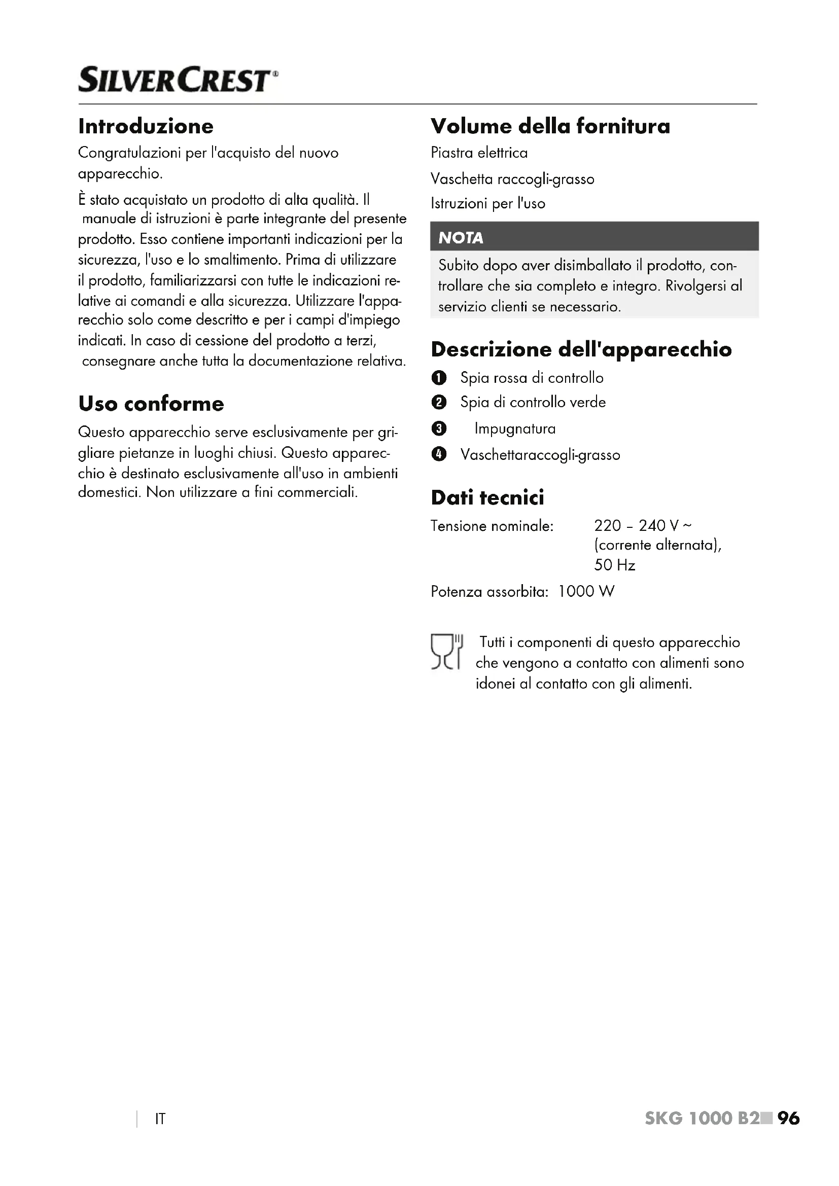 Vaschetta raccogli-grasso Dati tecnici Tensione nominale: 220 – 240 V ∼ (corrente alternata), 50 Hz Potenza assorbita: 1000 W Tutti i componenti di questo apparecchio che vengono a contatto con alimenti sono idonei al contatto con gli alimenti.SKG 1000 B2 IT