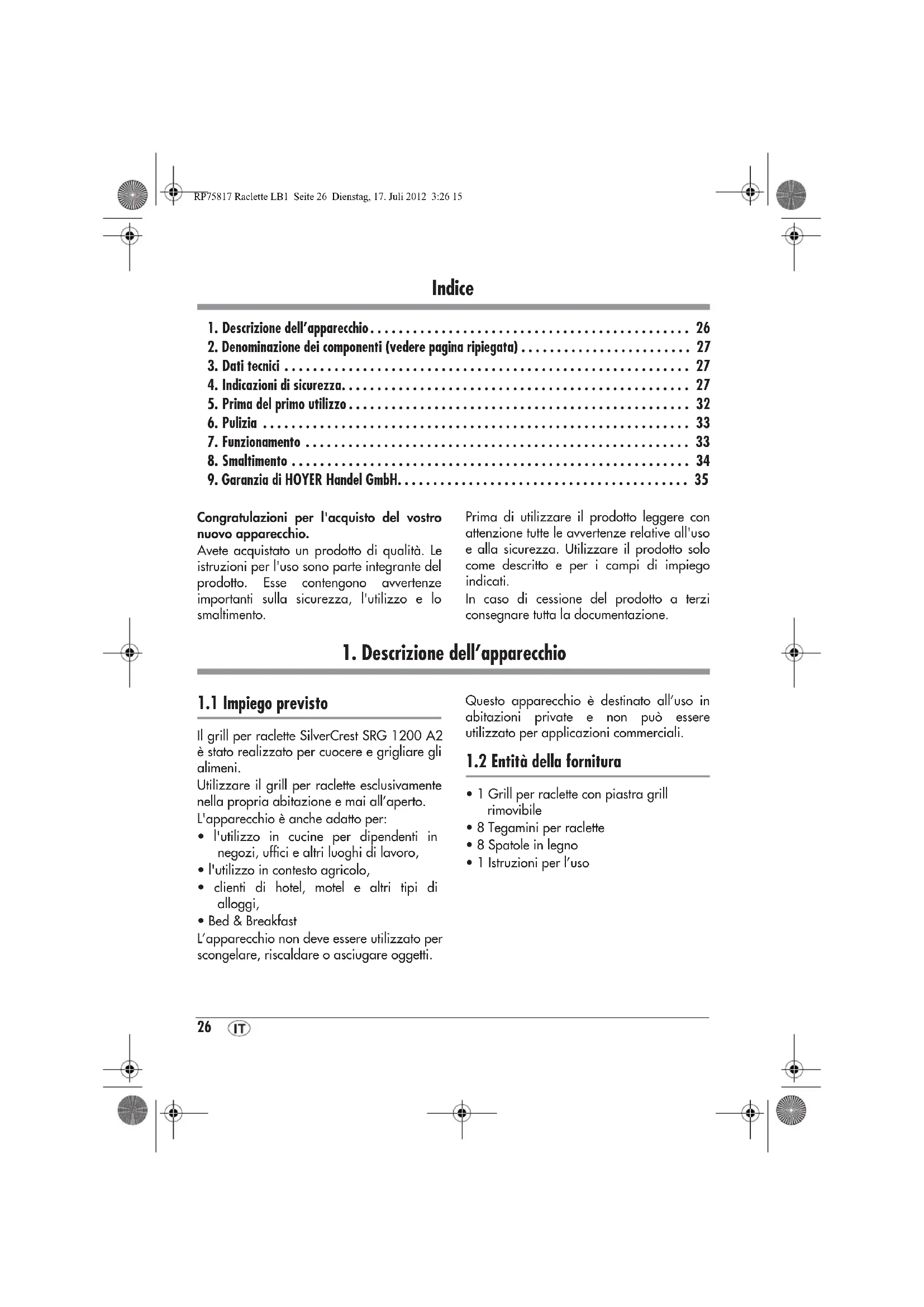 - Per tutte le richieste tenere a disposizione il numero di articolo (per questo apparecchio: IAN 75817) e lo scontrino di cassa comprovante l'acquisto. RP75817 Raclette LB1 Seite 35 Dienstag, 17. Juli 2012 3:26 1536