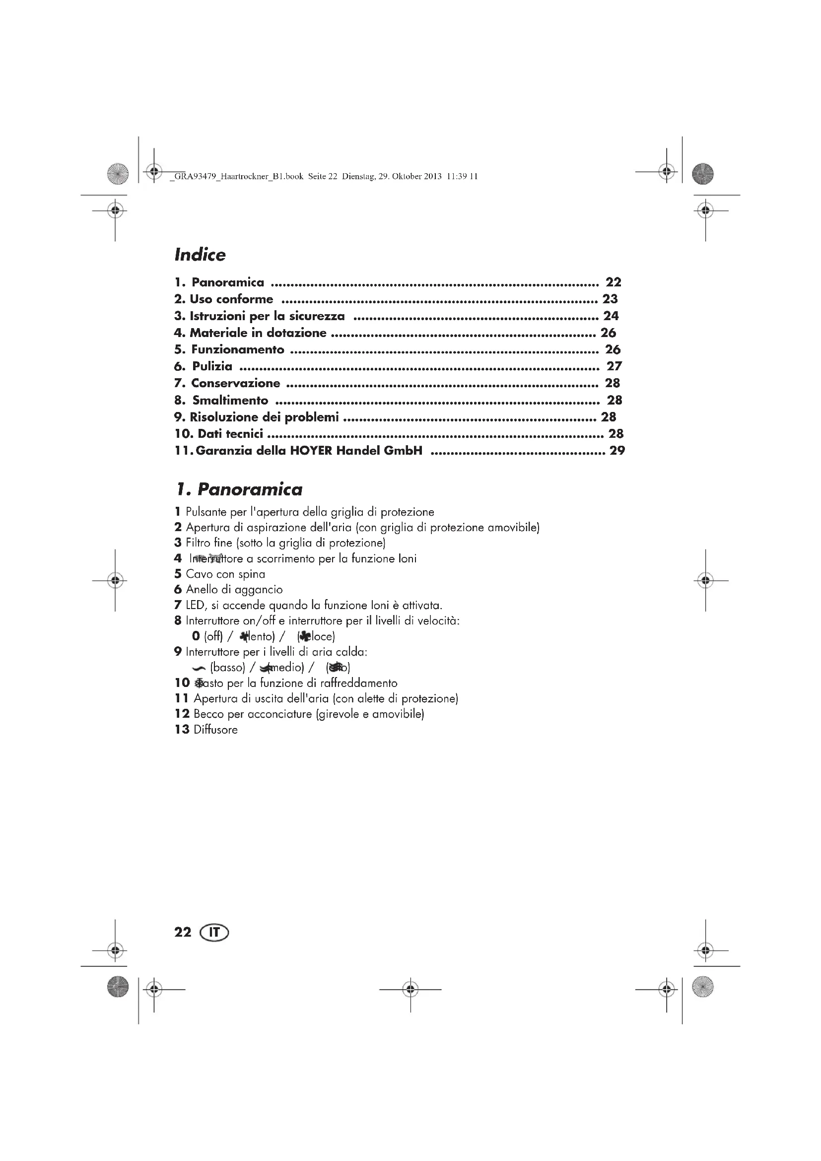 1 Pulsante per l'apertura della griglia di protezione 2 Apertura di aspirazione dell'aria (con griglia di protezione amovibile) 3 Filtro fine (sotto la griglia di protezione) 4 Interruttore a scorrimento per la funzione Ioni 5 Cavo con spina 6 Anello di aggancio 7 LED, si accende quando la funzione Ioni è attivata. 8 Interruttore on/off e interruttore per il livelli di velocità: 0 (off) / (lento) / (veloce) 9 Interruttore per i livelli di aria calda: (basso) / (medio) / (alto) 10 Tasto per la funzione di raffreddamento 11 Apertura di uscita dell'aria (con alette di protezione) 12 Becco per acconciature (girevole e amovibile) 13 Diffusore _GRA93479_Haartrockner_B1.book Seite 22 Dienstag, 29. Oktober 2013 11:39 1123