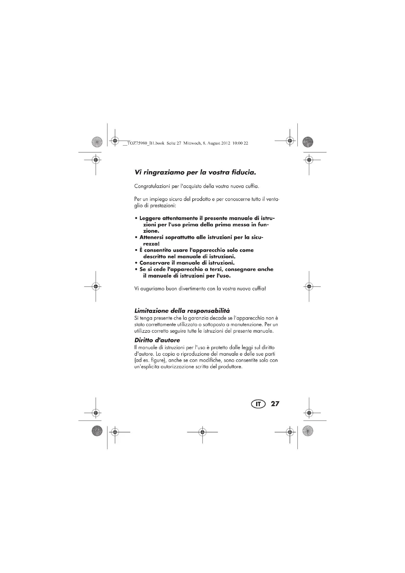 - Se si cede l'apparecchio a terzi, consegnare anche il manuale di istruzioni per l'uso. Vi auguriamo buon divertimento con la vostra nuova cuffia! Limitazione della responsabilità Si tenga presente che la garanzia decade se l'apparecchio non è stato correttamente utilizzato o sottoposto a manutenzione. Per un utilizzo corretto seguire tutte le istruzioni del presente manuale. Diritto d'autore Il manuale di istruzioni per l'uso è protetto dalle leggi sul diritto d'autore. La copia o riproduzione del manuale e delle sue parti (ad es. figure), anche se con modifiche, sono consentite solo con un'esplicita autorizzazione scritta del produttore. __TOZ75980_B1.book Seite 27 Mittwoch, 8. August 2012 10:00 2228