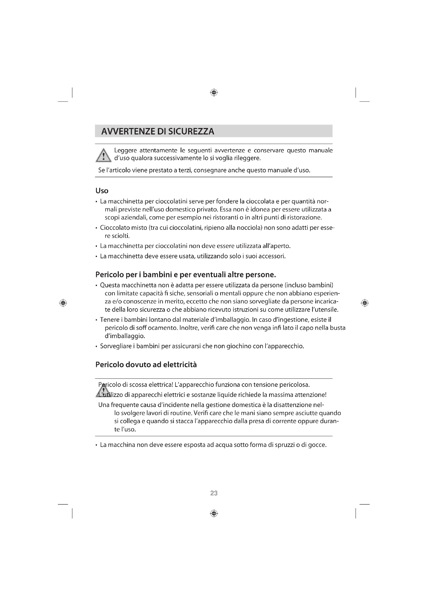- La macchinetta per cioccolatini serve per fondere la cioccolata e per quantità nor- mali previste nell’uso domestico privato. Essa non è idonea per essere utilizzata a scopi aziendali, come per esempio nei ristoranti o in altri punti di ristorazione.