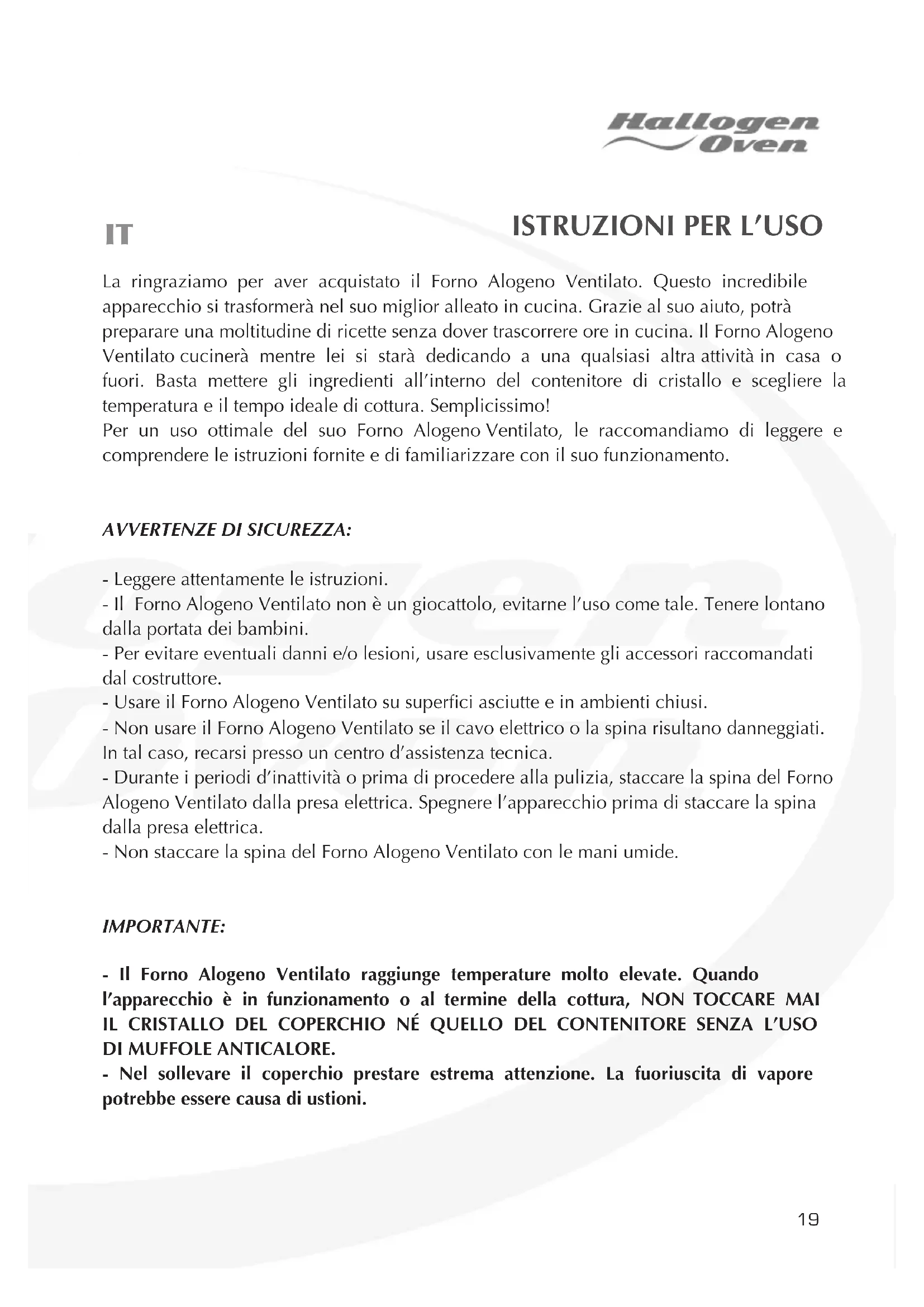 Das Symbol eines durchgestrichenen Müllcontainers auf Rädern bedeutet, dass Sie die lokalen Entsorgungsvorschriften für diesen Produkttyp kennen und befolgen müssen. Entsorgen Sie dieses Produkt nicht auf die gleiche Weise wie Ihren Hausmüll, sondern unter Befolgung der entsprechenden örtlichen Vorschriften. Elektrische und elektronische Produkte enthalten gefährliche Substanzen, die negative Auswirkungen auf die Umwelt oder die menschliche Gesundheit haben und angemessen entsorgt werden müssen. DE19 La ringraziamo per aver acquistato il Forno Alogeno Ventilato. Questo incredibile apparecchio si trasformerà nel suo miglior alleato in cucina. Grazie al suo aiuto, potrà preparare una moltitudine di ricette senza dover trascorrere ore in cucina. Il Forno Alogeno Ventilato cucinerà mentre lei si starà dedicando a una qualsiasi altra attività in casa o fuori. Basta mettere gli ingredienti all’interno del contenitore di cristallo e scegliere la temperatura e il tempo ideale di cottura. Semplicissimo! Per un uso ottimale del suo Forno Alogeno Ventilato, le raccomandiamo di leggere e comprendere le istruzioni fornite e di familiarizzare con il suo funzionamento. AVVERTENZE DI SICUREZZA: - Leggere attentamente le istruzioni. - Il Forno Alogeno Ventilato non è un giocattolo, evitarne l’uso come tale. Tenere lontano dalla portata dei bambini. - Per evitare eventuali danni e/o lesioni, usare esclusivamente gli accessori raccomandati dal costruttore. - Usare il Forno Alogeno Ventilato su superci asciutte e in ambienti chiusi. - Non usare il Forno Alogeno Ventilato se il cavo elettrico o la spina risultano danneggiati. In tal caso, recarsi presso un centro d’assistenza tecnica. - Durante i periodi d’inattività o prima di procedere alla pulizia, staccare la spina del Forno Alogeno Ventilato dalla presa elettrica. Spegnere l’apparecchio prima di staccare la spina dalla presa elettrica. - Non staccare la spina del Forno Alogeno Ventilato con le mani umide. IMPORTANTE: - Il Forno Alogeno Ventilato raggiunge temperature molto elevate. Quando l’apparecchio è in funzionamento o al termine della cottura, NON TOCCARE MAI IL CRISTALLO DEL COPERCHIO NÉ QUELLO DEL CONTENITORE SENZA L’USO DI MUFFOLE ANTICALORE. - Nel sollevare il coperchio prestare estrema attenzione. La fuoriuscita di vapore potrebbe essere causa di ustioni.