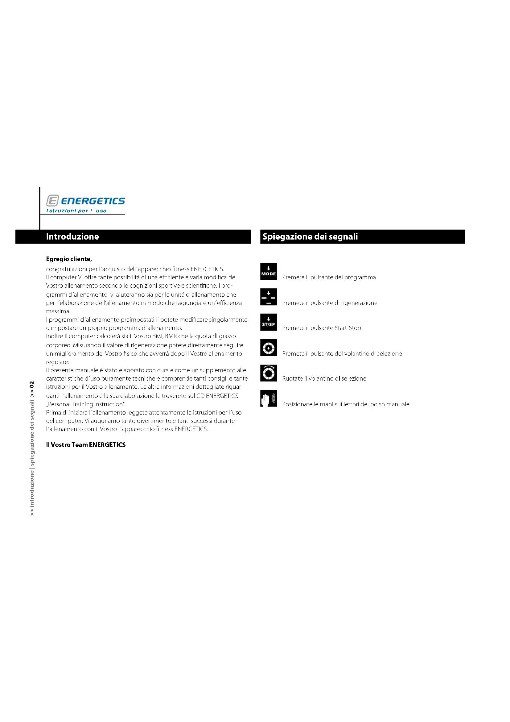 - La pila en el cinto de tórax está muy débil o descargada. El ordenador ha fallado Rara vez, sobre todo debido a un cambio de tensión o descarga estítica, el ordenador puede fallar. E-204 normalmente se reactiva solo. Si el ordenador no volviera a activarse, realice el rearme. Para ello saque la toma de corriente del enchufe, espere unos segundos y vuelva a introducirla. Cuidado Atienda que en el buje del ordenador no penetre un líquido. Limpie el orde- nador con un paño húmedo. No use productos de limpieza abrasivos. Mantenimiento El ordenador no requiere un mantenimiento especial. Revise regularmente el asentamiento fijo de los tornillos y acoplamientos. Cambie inmediatamente piezas defectuosas. Póngase en contacto con el vendedor de ENERGETICS.Instrucción de uso >> 36IT Indice Introduzione ............................................................02 Spiegazione dei segnali ..................................................02 Display e suoi indicatori ...........................................03 Custodia ..........................................................03 Montaggio ed avviamento ...............................................04 Collegamento del computer ......................................04 Accensione del computer .........................................04 Start, controllo, tono di segnalazione ..............................04 Regime di riposo . . . . . . . . . . . . . . . . . . . . . . . . . . . . . . . . . . . . . . . . . . . . . . . . . . 04 Avviamento veloce . . . . . . . . . . . . . . . . . . . . . . . . . . . . . . . . . . . . . . . . . . . . . . . . . . . . . . 05 Valori base ed impostazioni base .........................................06 Programmi d´allenamento – funzioni ed impostazioni ...................07 Che cos´é un programma d´allenamento ..........................07 Impostazione personalizzata/parametri d´allenamento ............07 Uso dei programmi d´allenamento ................................10 Informazioni generali riguardanti i programmi .....................17 Selezione ed impostazione dei programmi ...............................18 Programi individuali ...............................................18 Programma manuale (P 1) ...................................18 Programma dell´utente (P 13) ...............................20 Programmi preimpostati ..........................................22 Giro (P 2) ....................................................23 Traversata (P 3) ..............................................23 Collina (P 4) .................................................24 Montagna (P 5) .............................................24 Passo (P 6) ..................................................24 Intervallo (P 7) ..............................................24 Programmi con un controllo della frequenza cardiaca ..............25 Controllo individuale della frequenza cardiaca (P 9) ..........25 Controllo della frequenza cardiaca (P 10 – 12) ...............27 BMI-BMR-misurazione del grasso corporeo (P 8) ...................29 Programma della rigenerazione ...................................32 Intervallo/interruzione d´allenamento e Reset .....................33 Sicurezza ..........................................................33 Domande frequenti ......................................................34 Servizio assistenza .......................................................35 Ricerca guasti .....................................................35 Cura . . .............................................................35 Manutenzione .....................................................35 Istruzioni per l´uso E-204 >> indice >> 01Istruzioni per l´uso >> introduzione | spiegazione dei segnali >> 02 Spiegazione dei segnali Premete il pulsante del programma Premete il pulsante di rigenerazione Premete il pulsante Start-Stop Premete il pulsante del volantino di selezione Ruotate il volantino di selezione Posizionate le mani sui lettori del polso manuale Introduzione Egregio cliente, congratulazioni per l´acquisto dell´apparecchio fitness ENERGETICS. Il computer Vi offre tante possibilitá di una efficiente e varia modifica del Vostro allenamento secondo le cognizioni sportive e scientifiche. I pro- grammi d´allenamento vi aiuteranno sia per le unitá d´allenamento che per l´elaborazione dell‘allenamento in modo che ragiungiate un´efficienza massima. I programmi d´allenamento preimpostati li potete modificare singolarmente o impostare un proprio programma d´allenamento. Inoltre il computer calcolerá sia il Vostro BMI, BMR che la quota di grasso corporeo. Misurando il valore di rigenerazione potete direttamente seguire un miglioramento del Vostro fisico che avverrá dopo il Vostro allenamento regolare. Il presente manuale é stato elaborato con cura e come un supplemento alle caratteristiche d´uso puramente tecniche e comprende tanti consigli e tante istruzioni per il Vostro allenamento. Le altre informazioni dettagliate riguar- danti l´allenamento e la sua elaborazione le troverete sul CD ENERGETICS „Personal Training Instruction“. Prima di iniziare l´allenamento leggete attentamente le istruzioni per l´uso del computer. Vi auguriamo tanto divertimento e tanti successi durante l´allenamento con il Vostro l´apparecchio fitness ENERGETICS. Il Vostro Team ENERGETICSIT >> spiegazione dei segnali >> 03 Display e suoi indicatori (D1) START– avvia il programma (D2) STOP – interruzione del programma o si passa alla selezione (D3) PROGRAM – programma scelto (D4) LEVEL – livello impostato dell´intensitá di carico (D5) Sesso – femminile (D6) Sesso – maschile (D7) Colonne di tempo/colonne di resistenze – tempo d´allenamento diviso in 10 fasi, in rapporto al tempo d´allenamento (D8) ODO – totale di chilometri percorsi (D9) DIST – numero di chilometri percorsi nel programma d´allenamento (D10) SPEED – velocitá (chilometro/ora) (D11) RPM – frequenza della pedalata (giri della pedi