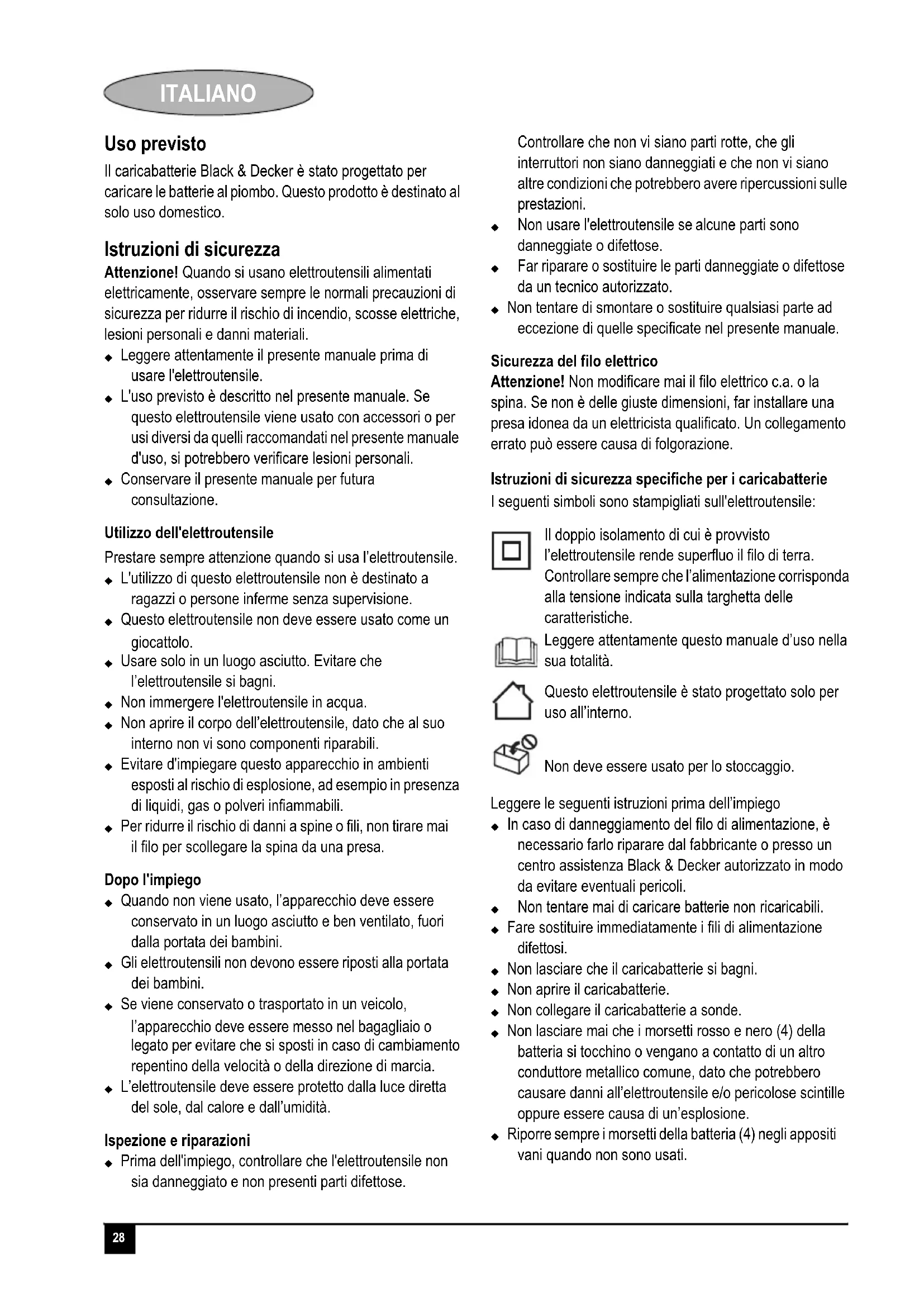 Il caricabatterie Black & Decker è stato progettato per caricare le batterie al piombo. Questo prodotto è destinato al solo uso domestico.