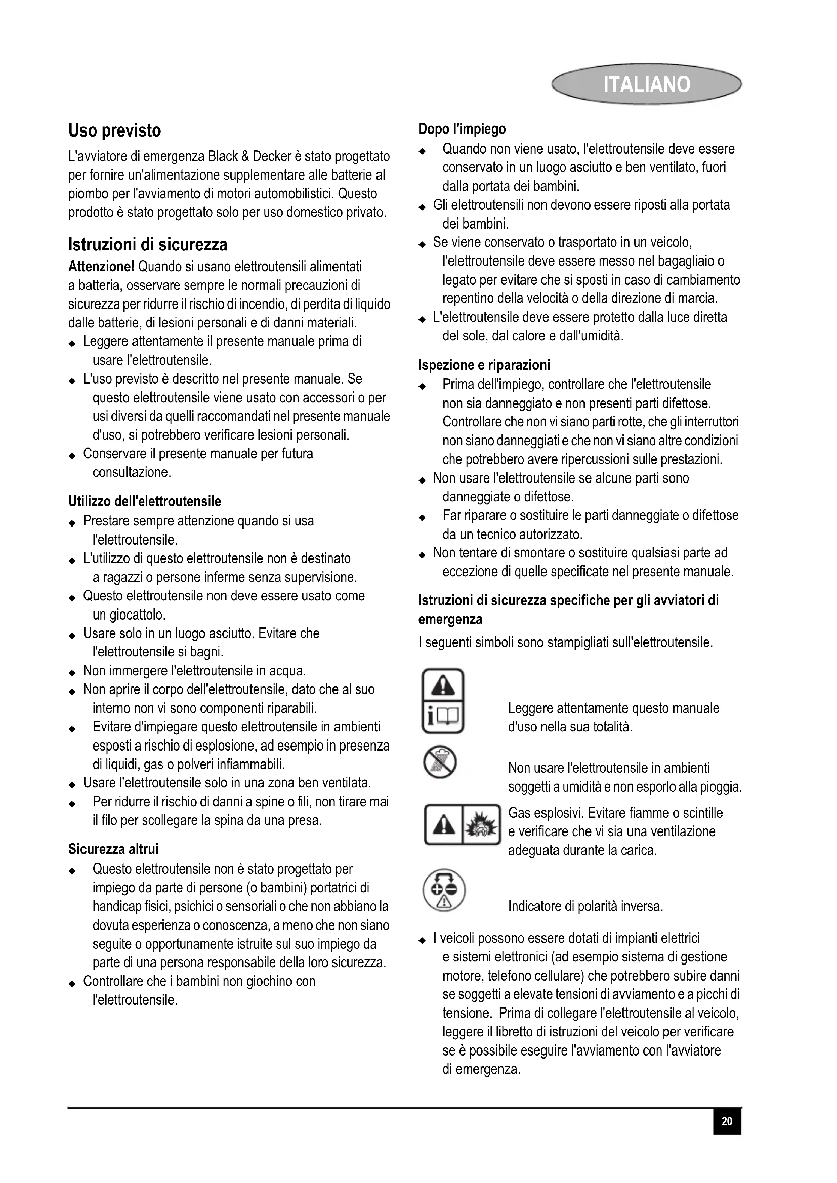 L'avviatore di emergenza Black & Decker è stato progettato per fornire un'alimentazione supplementare alle batterie al piombo per l'avviamento di motori automobilistici. Questo prodotto è stato progettato solo per uso domestico privato.