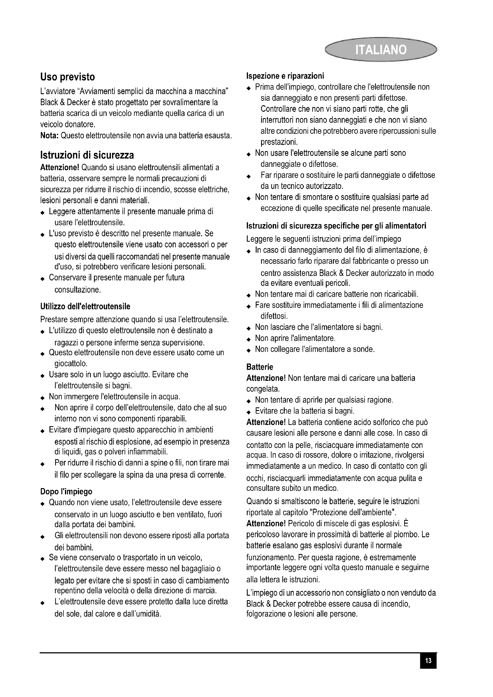 Black & Decker déclare que ces produits sont conformes à : EN60335, EN60598 Le soussigné est responsable des données de la fiche technique et fait cette déclaration au nom de Black & Decker Kevin Hewitt Directeur Ingénierie Client Spennymoor, County Durham, DL16 6JG, Royaume-Uni 12-08-2008 Recyclage. Cet appareil ne doit pas être jeté avec les déchets ménagers. BDBBC2C Tension d’entrée V c.c. 12 Tension de sortie V c.c. 14,5 Courant de sortie (max) A 7,5 Poids kg 1,9312 FRANÇAIS Garantie Black & Decker vous assure la qualité de ses produits et vous offre une garantie très étendue. Ce certificat de garantie est un document supplémentaire et ne peut en aucun cas se substituer à vos droits légaux. La garantie est valable sur tout le territoire des États Membres de l'Union Européenne et de la Zone de Libre Échange Européenne. Si un produit Black & Decker s'avère défectueux en raison de matériaux en mauvais état, d'une erreur humaine, ou d'un manque de conformité dans les 24 mois suivant la date d'achat, Black & Decker garantit le remplacement des pièces défectueuses, la réparation des produits usés ou cassés ou remplace ces produits à la convenance du client, sauf dans les circonstances suivantes : X Le produit a été utilisé dans un but commercial, professionnel, ou a été loué. X Le produit a été mal utilisé ou avec négligence. X Le produit a subi des dommages à cause de corps étrangers, de substances ou d'accidents. X Des réparations ont été tentées par des techniciens ne faisant pas partie du service technique de Black & Decker. Pour avoir recours à la garantie, il est nécessaire de fournir une preuve d'achat au vendeur ou à un réparateur agréé. Pour connaître l'adresse du réparateur agréé le plus proche de chez vous, contactez le bureau Black & Decker à l'adresse indiquée dans ce manuel. Vous pourrez aussi trouver une liste de réparateurs agréés de Black & Decker et de plus amples détails concernant notre service après-vente sur le site Internet : www.2helpU.com Visitez notre site Web www.blackanddecker.fr pour enregistrer votre nouveau produit Black & Decker et être informé des nouveaux produits et des offres spéciales. Pour plus d'informations concernant la marque Black & Decker et notre gamme de produits, consultez notre site www.blackanddecker.fr.13 ITALIANO Italiano Uso previsto L’avviatore “Avviamenti semplici da macchina a macchina” Black & Decker è stato progettato per sovralimentare la batteria scarica di un veicolo mediante quella carica di un veicolo donatore. Nota: Questo elettroutensile non avvia una batteria esausta. Istruzioni di sicurezza Attenzione! Quando si usano elettroutensili alimentati a batteria, osservare sempre le normali precauzioni di sicurezza per ridurre il rischio di incendio, scosse elettriche, lesioni personali e danni materiali. X Leggere attentamente il presente manuale prima di usare l'elettroutensile. X L'uso previsto è descritto nel presente manuale. Se questo elettroutensile viene usato con accessori o per usi diversi da quelli raccomandati nel presente manuale d'uso, si potrebbero verificare lesioni personali. X Conservare il presente manuale per futura consultazione. Utilizzo dell'elettroutensile Prestare sempre attenzione quando si usa l’elettroutensile. X L'utilizzo di questo elettroutensile non è destinato a ragazzi o persone inferme senza supervisione. X Questo elettroutensile non deve essere usato come un giocattolo. X Usare solo in un luogo asciutto. Evitare che l’elettroutensile si bagni. X Non immergere l'elettroutensile in acqua. X Non aprire il corpo dell’elettroutensile, dato che al suo interno non vi sono componenti riparabili. X Evitare d'impiegare questo apparecchio in ambienti esposti al rischio di esplosione, ad esempio in presenza di liquidi, gas o polveri infiammabili. X Per ridurre il rischio di danni a spine o fili, non tirare mai il filo per scollegare la spina da una presa di corrente. Dopo l'impiego X Quando non viene usato, l’elettroutensile deve essere conservato in un luogo asciutto e ben ventilato, fuori dalla portata dei bambini. X Gli elettroutensili non devono essere riposti alla portata dei bambini. X Se viene conservato o trasportato in un veicolo, l’elettroutensile deve essere messo nel bagagliaio o legato per evitare che si sposti in caso di cambiamento repentino della velocità o della direzione di marcia. X L’elettroutensile deve essere protetto dalla luce diretta del sole, dal calore e dall’umidità. Ispezione e riparazioni X Prima dell'impiego, controllare che l'elettroutensile non sia danneggiato e non presenti parti difettose. Controllare che non vi siano parti rotte, che gli interruttori non siano danneggiati e che non vi siano altre condizioni che potrebbero avere ripercussioni sulle prestazioni. X Non usare l'elettroutensile se alcune parti sono danneggiate o difettose. X Far riparare o sostituire le parti danneggiate o difettose da un tecnico autorizzato. X Non tentare di smontare o sostituire qualsiasi parte ad eccezione di quelle specificate nel presente manuale. Istruzioni di sicurezza specifiche per gli alimentatori Leggere le seguenti istruzioni prima dell’impiego X In caso di danneggiamento del filo di alimentazione, è necessario farlo riparare dal fabbricante o presso un centro assistenza Black & Decker autorizzato in modo da evitare eventuali pericoli. X Non tentare mai di caricare batterie non ricaricabili. X Fare sostituire immediatamente i fili di alimentazione difettosi. X Non lasciare che l'alimentatore si bagni. X Non aprire l'alimentatore. X Non collegare l'alimentatore a sonde. Batterie Attenzione! Non tentare mai di caricare una batteria congelata. X Non tentare di aprirle per qualsiasi ragione. X Evitare che la batteria si bagni. Attenzione! La batteria contiene acido solforico che può causare lesioni alle persone e danni alle cose. In caso di contatto con la pelle, risciacquare immediatamen