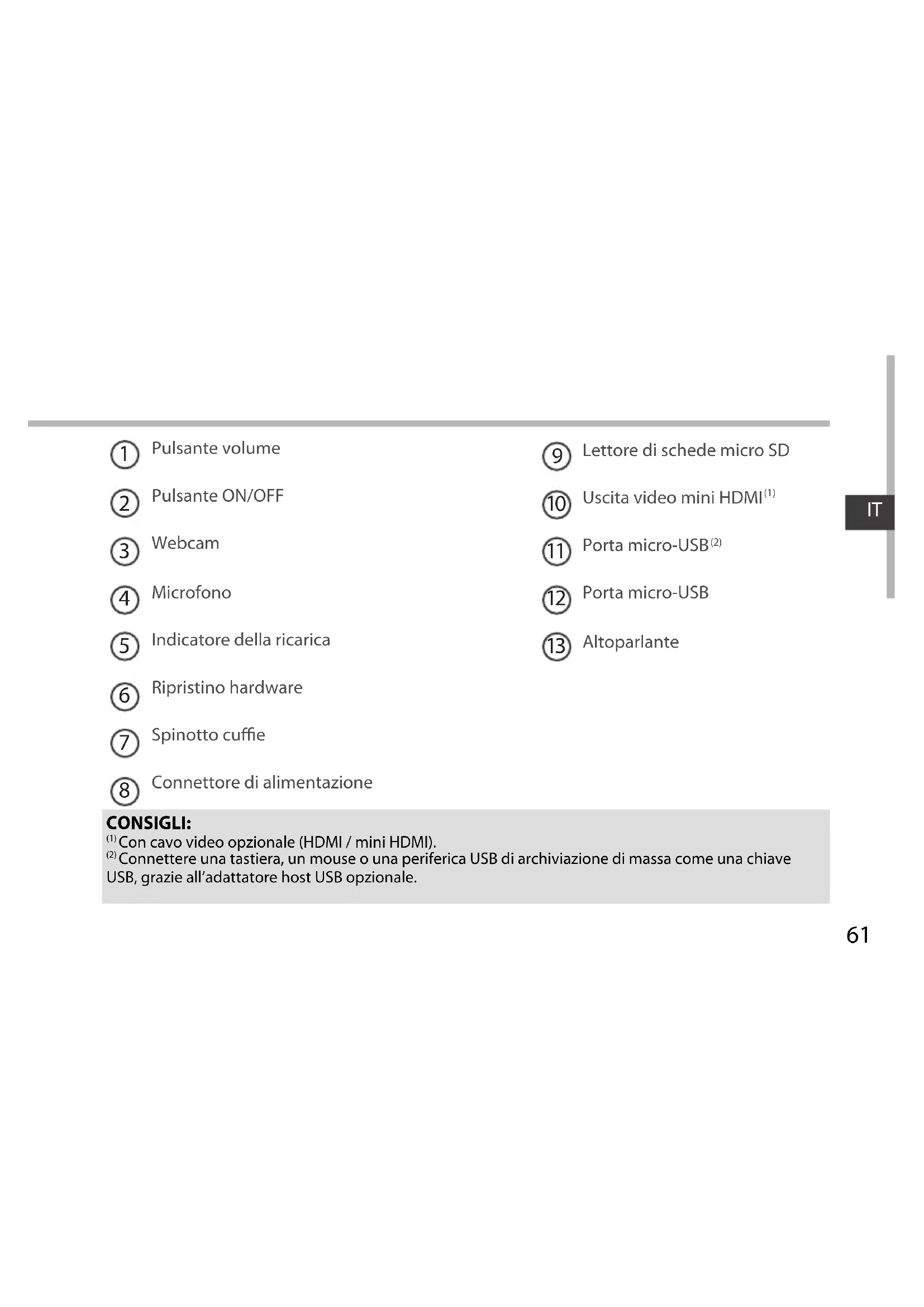 CONSIGLI: (1) Con cavo video opzionale (HDMI / mini HDMI). (2) Connettere una tastiera, un mouse o una periferica USB di archiviazione di massa come una chiave USB, grazie all’adattatore host USB opzionale.