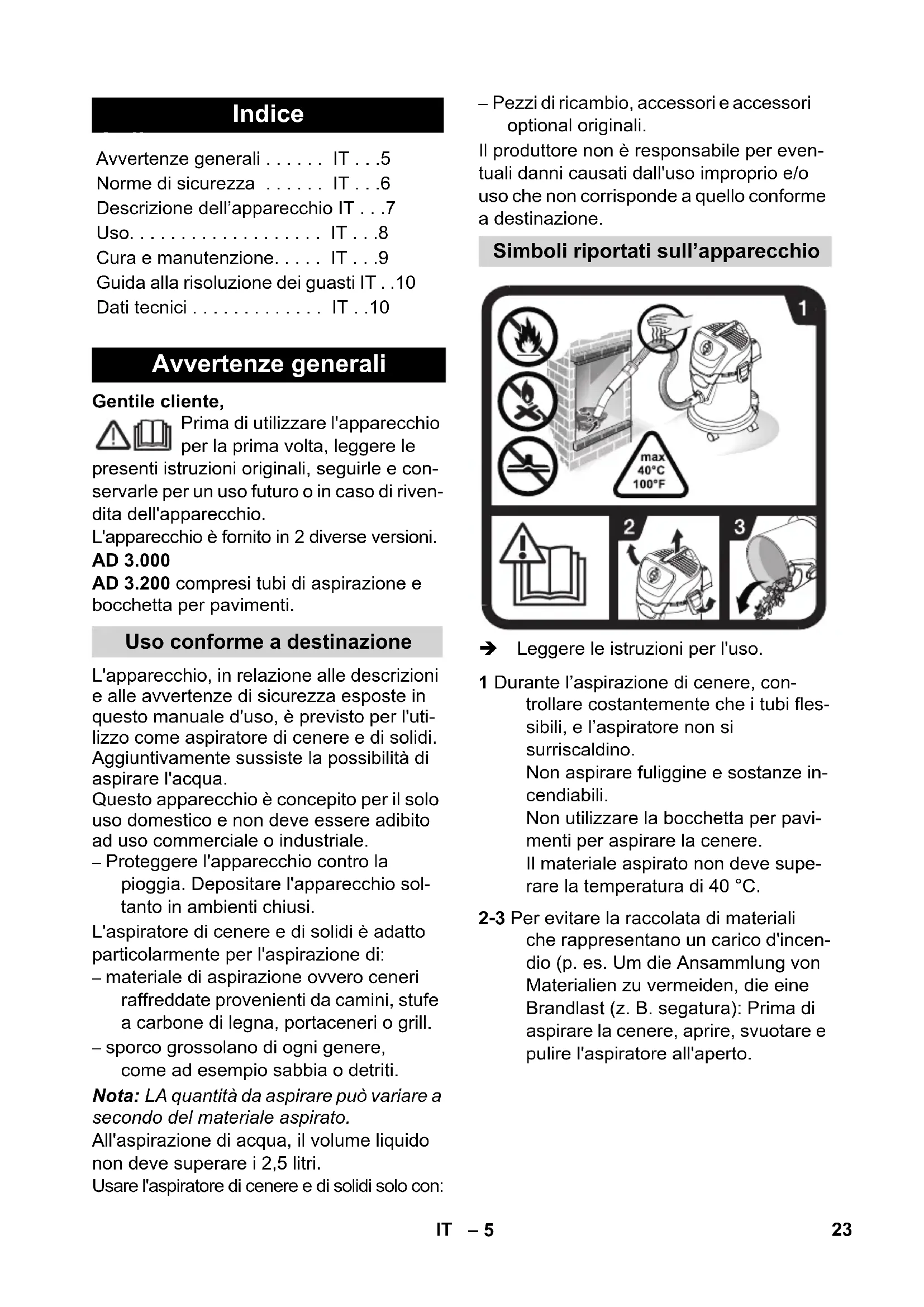 - Puissance P nom 1000 W Puissance P max 1200 W Classe de protection II Protection du réseau (à action retardée) 10 A Volume de la cuve 17 l Arrivée d'eau avec poignée 2,5 l Arrivée d'eau avec buse de sol 2,5 l Câble d’alimentation H05VV-F 2x0,75 Niveau de pression acous- tique (EN 60704-2-1) 73 dB(A) Poids (sans accessoire) 7,4 kg 22 FRItaliano – 5 Gentile cliente, Prima di utilizzare l'apparecchio per la prima volta, leggere le presenti istruzioni originali, seguirle e con- servarle per un uso futuro o in caso di riven- dita dell'apparecchio. L'apparecchio è fornito in 2 diverse versioni. AD 3.000 AD 3.200 compresi tubi di aspirazione e bocchetta per pavimenti. L'apparecchio, in relazione alle descrizioni e alle avvertenze di sicurezza esposte in questo manuale d'uso, è previsto per l'uti- lizzo come aspiratore di cenere e di solidi. Aggiuntivamente sussiste la possibilità di aspirare l'acqua. Questo apparecchio è concepito per il solo uso domestico e non deve essere adibito ad uso commerciale o industriale. – Proteggere l'apparecchio contro la pioggia. Depositare l'apparecchio sol- tanto in ambienti chiusi. L'aspiratore di cenere e di solidi è adatto particolarmente per l'aspirazione di: – materiale di aspirazione ovvero ceneri raffreddate provenienti da camini, stufe a carbone di legna, portaceneri o grill. – sporco grossolano di ogni genere, come ad esempio sabbia o detriti. Nota: LA quantità da aspirare può variare a secondo del materiale aspirato. All'aspirazione di acqua, il volume liquido non deve superare i 2,5 litri. Usare l'aspiratore di cenere e di solidi solo con: – Pezzi di ricambio, accessori e accessori optional originali. Il produttore non è responsabile per even- tuali danni causati dall'uso improprio e/o uso che non corrisponde a quello conforme a destinazione. Leggere le istruzioni per l'uso. Indice Avvertenze generali