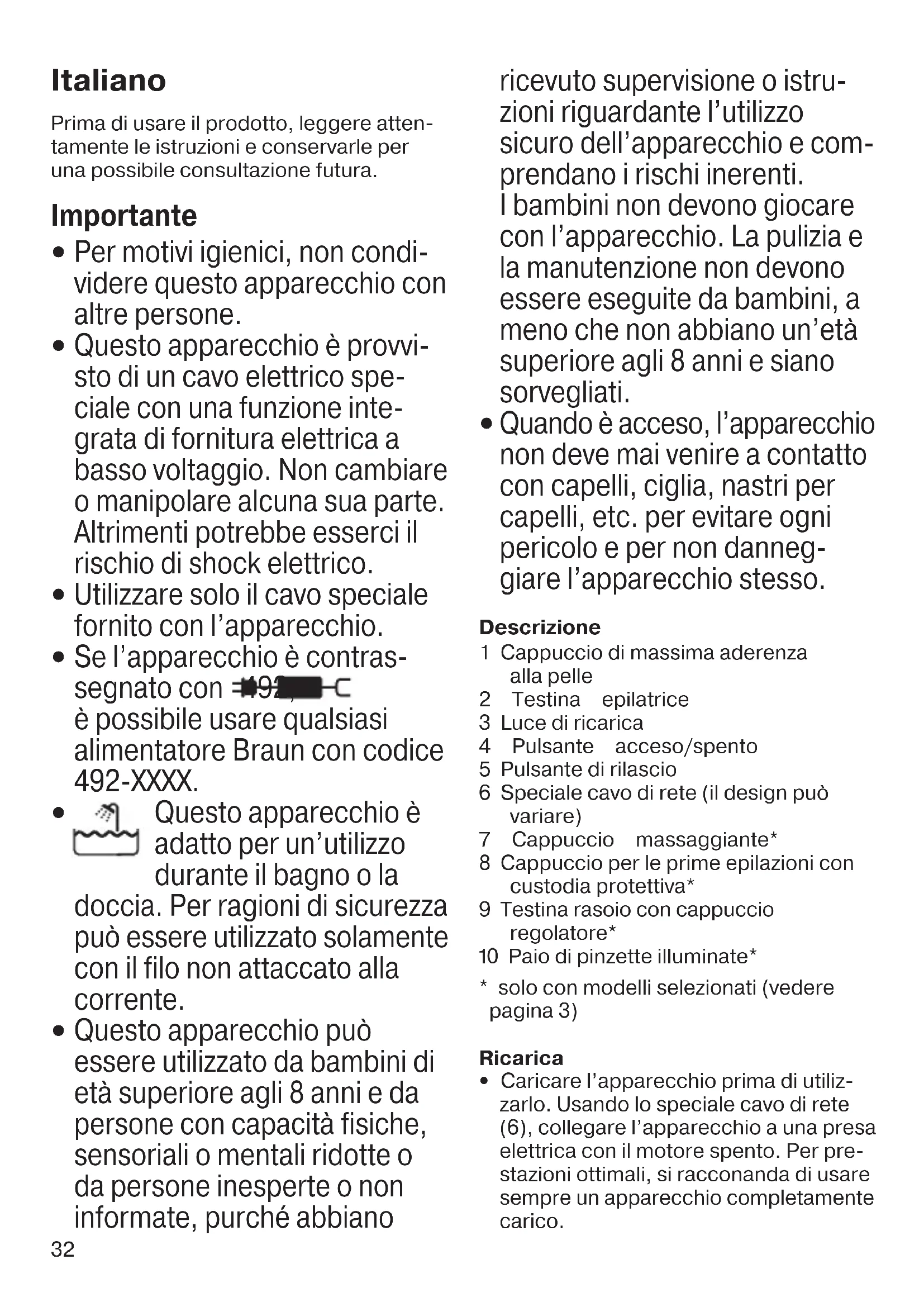 Quando è acceso, l’apparecchio non deve mai venire a contatto con capelli, ciglia, nastri per capelli, etc. per evitare ogni pericolo e per non danneg- giare l’apparecchio stesso. Descrizione 1 Cappuccio di massima aderenza alla pelle 2 Testina epilatrice 3 Luce di ricarica 4 Pulsante acceso/spento 5 Pulsante di rilascio 6 Speciale cavo di rete (il design può variare) 7 Cappuccio massaggiante* 8 Cappuccio per le prime epilazioni con custodia protettiva* 9 Testina rasoio con cappuccio regolatore* 0 Paio di pinzette illuminate*