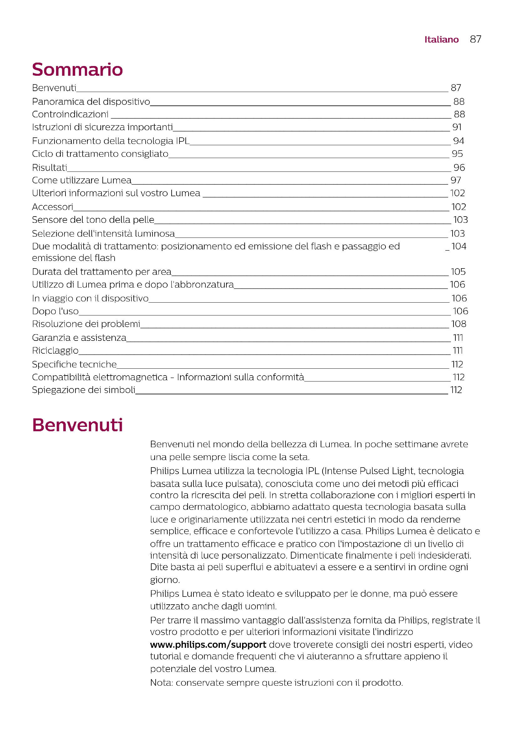 FrançaisItaliano Sommario Benvenuti______________________________________________________________________________________________ 87 Panoramica del dispositivo____________________________________________________________________________ 88 Controindicazioni ______________________________________________________________________________________ 88 Istruzioni di sicurezza importanti______________________________________________________________________ 91 Funzionamento della tecnologia IPL__________________________________________________________________ 94 Ciclo di trattamento consigliato_______________________________________________________________________ 95 Risultati_________________________________________________________________________________________________ 96 Come utilizzare Lumea________________________________________________________________________________ 97 Ulteriori informazioni sul vostro Lumea ______________________________________________________________ 102 Accessori_______________________________________________________________________________________________ 102 Sensore del tono della pelle___________________________________________________________________________ 103 Selezione dell'intensità luminosa_____________________________________________________________________ 103 Due modalità di trattamento: posizionamento ed emissione del flash e passaggio ed emissione del flash _ 104 Durata del trattamento per area______________________________________________________________________ 105 Utilizzo di Lumea prima e dopo l'abbronzatura______________________________________________________ 106 In viaggio con il dispositivo____________________________________________________________________________ 106 Dopo l'uso______________________________________________________________________________________________ 106 Risoluzione dei problemi______________________________________________________________________________ 108 Garanzia e assistenza__________________________________________________________________________________ 111 Riciclaggio______________________________________________________________________________________________ 111 Specifiche tecniche____________________________________________________________________________________ 112 Compatibilità elettromagnetica - Informazioni sulla conformità_____________________________________ 112 Spiegazione dei simboli_______________________________________________________________________________ 112 Benvenuti Benvenuti nel mondo della bellezza di Lumea. In poche settimane avrete una pelle sempre liscia come la seta. Philips Lumea utilizza la tecnologia IPL (Intense Pulsed Light, tecnologia basata sulla luce pulsata), conosciuta come uno dei metodi più efficaci contro la ricrescita dei peli. In stretta collaborazione con i migliori esperti in campo dermatologico, abbiamo adattato questa tecnologia basata sulla luce e originariamente utilizzata nei centri estetici in modo da renderne semplice, efficace e confortevole l'utilizzo a casa. Philips Lumea è delicato e offre un trattamento efficace e pratico con l'impostazione di un livello di intensità di luce personalizzato. Dimenticate finalmente i peli indesiderati. Dite basta ai peli superflui e abituatevi a essere e a sentirvi in ordine ogni giorno. Philips Lumea è stato ideato e sviluppato per le donne, ma può essere utilizzato anche dagli uomini. Per trarre il massimo vantaggio dall'assistenza fornita da Philips, registrate il vostro prodotto e per ulteriori informazioni visitate l'indirizzo www.philips.com/support dove troverete consigli dei nostri esperti, video tutorial e domande frequenti che vi aiuteranno a sfruttare appieno il potenziale del vostro Lumea.