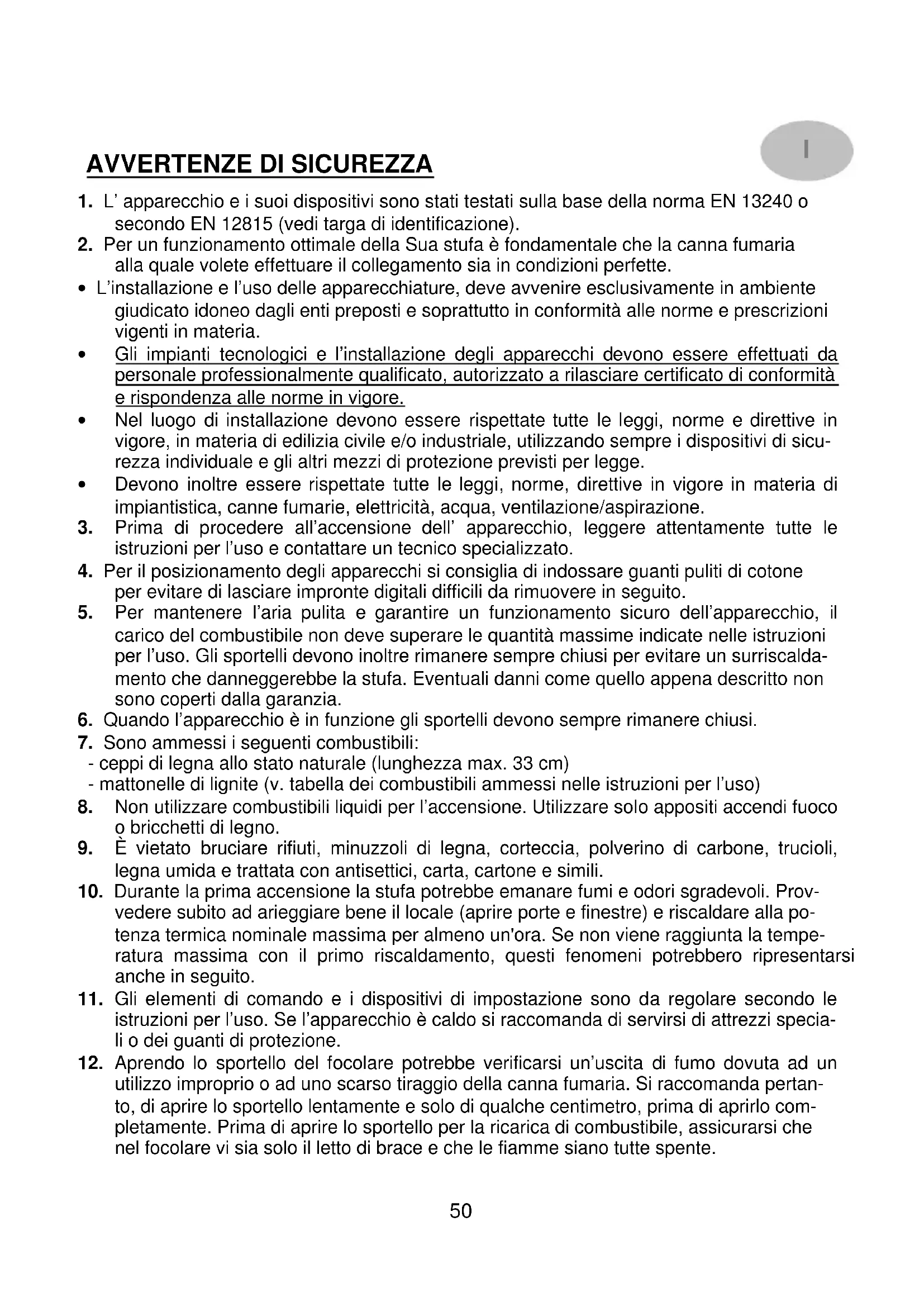 L' apparecchio e i loro dispositivi sono stati testati sulla base della norma EN 13240 o secondo EN 12815 (vedi targa di identificazione).