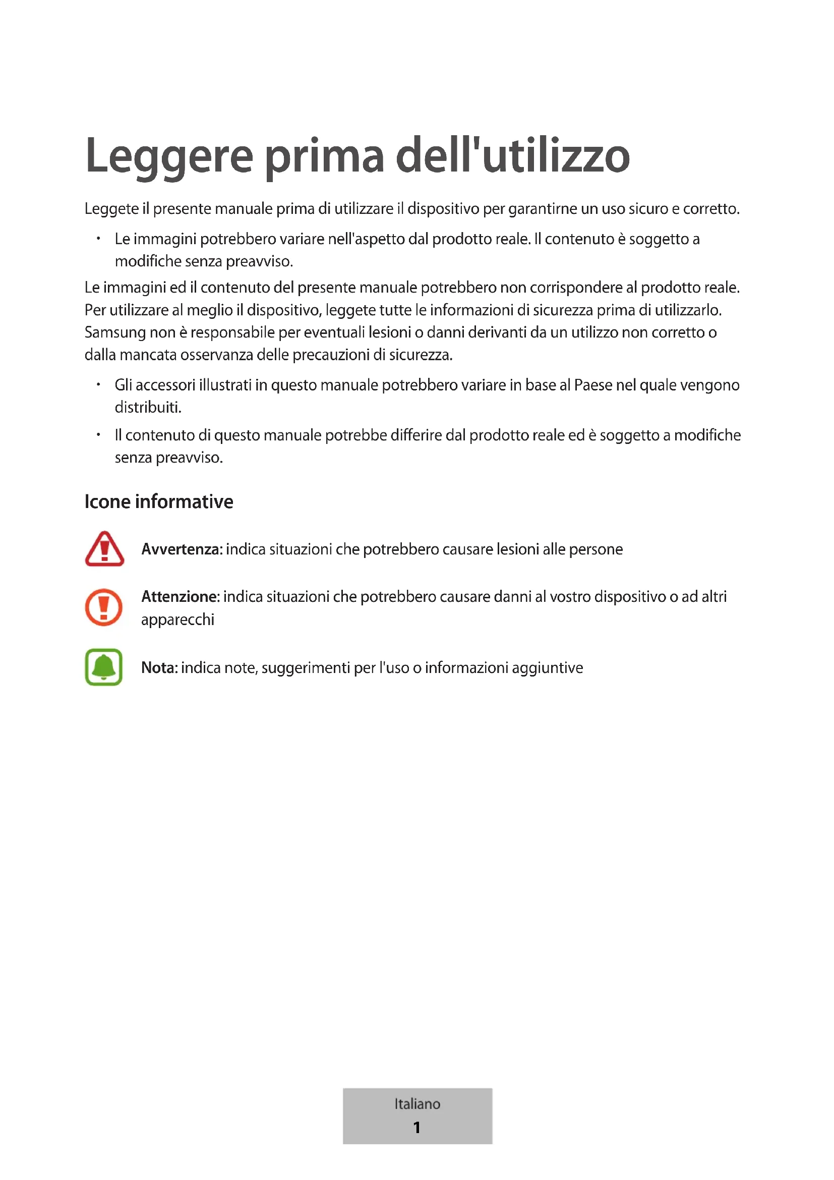 Le immagini potrebbero variare nell'aspetto dal prodotto reale. Il contenuto è soggetto a modifiche senza preavviso. Le immagini ed il contenuto del presente manuale potrebbero non corrispondere al prodotto reale. Per utilizzare al meglio il dispositivo, leggete tutte le informazioni di sicurezza prima di utilizzarlo. Samsung non è responsabile per eventuali lesioni o danni derivanti da un utilizzo non corretto o dalla mancata osservanza delle precauzioni di sicurezza.