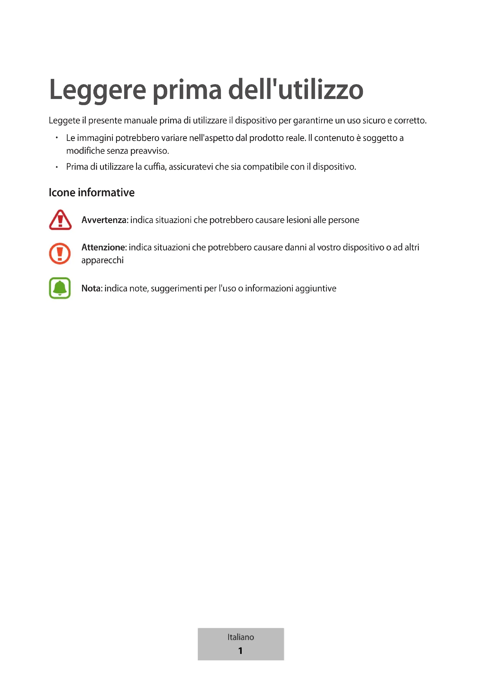 Prima di utilizzare la cuffia, assicuratevi che sia compatibile con il dispositivo. Icone informative Avvertenza: indica situazioni che potrebbero causare lesioni alle persone Attenzione: indica situazioni che potrebbero causare danni al vostro dispositivo o ad altri apparecchi Nota: indica note, suggerimenti per l'uso o informazioni aggiuntive Italiano