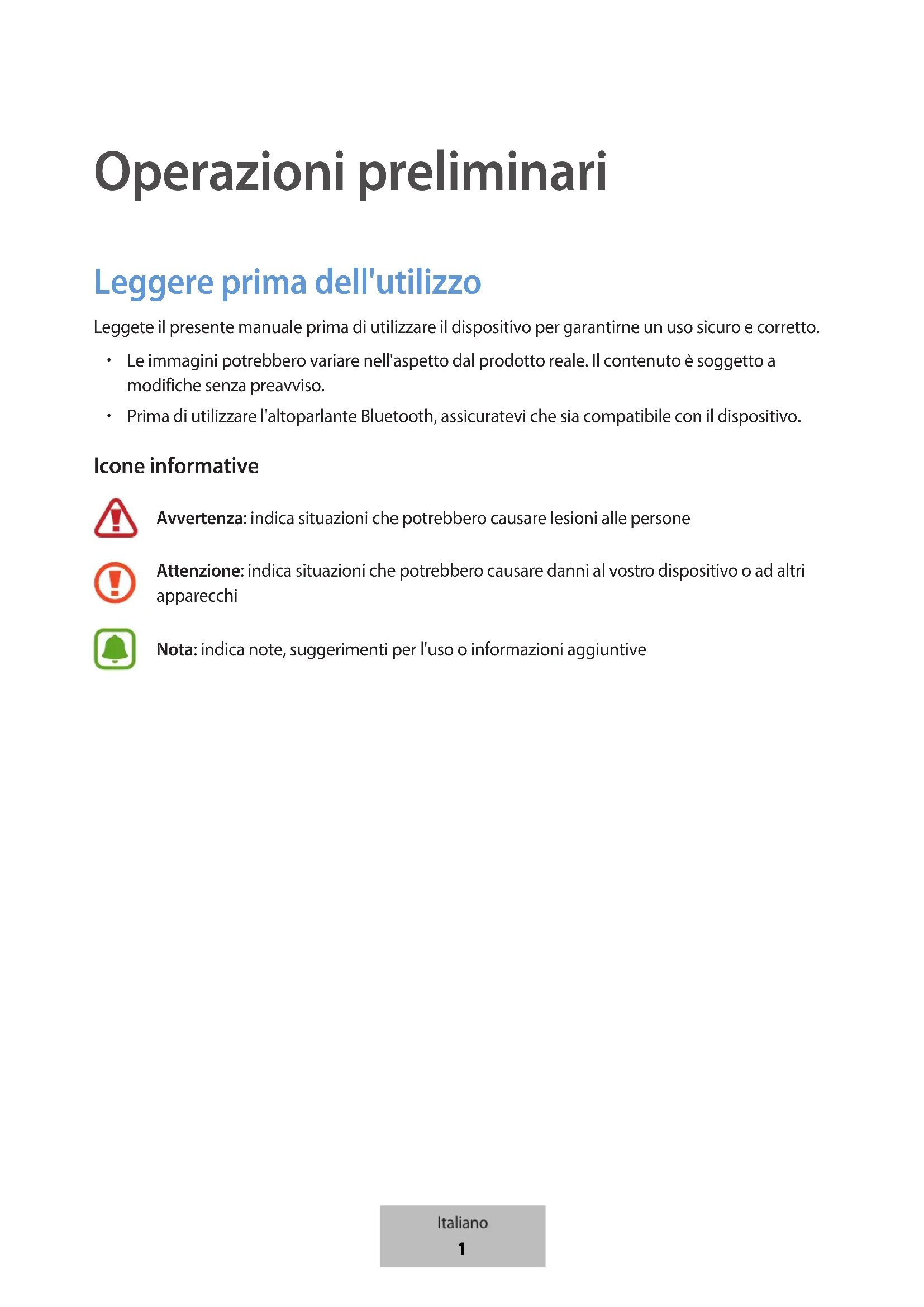 Prima di utilizzare l'altoparlante Bluetooth, assicuratevi che sia compatibile con il dispositivo. Icone informative Avvertenza: indica situazioni che potrebbero causare lesioni alle persone Attenzione: indica situazioni che potrebbero causare danni al vostro dispositivo o ad altri apparecchi Nota: indica note, suggerimenti per l'uso o informazioni aggiuntive Italiano 1Operazioni preliminari