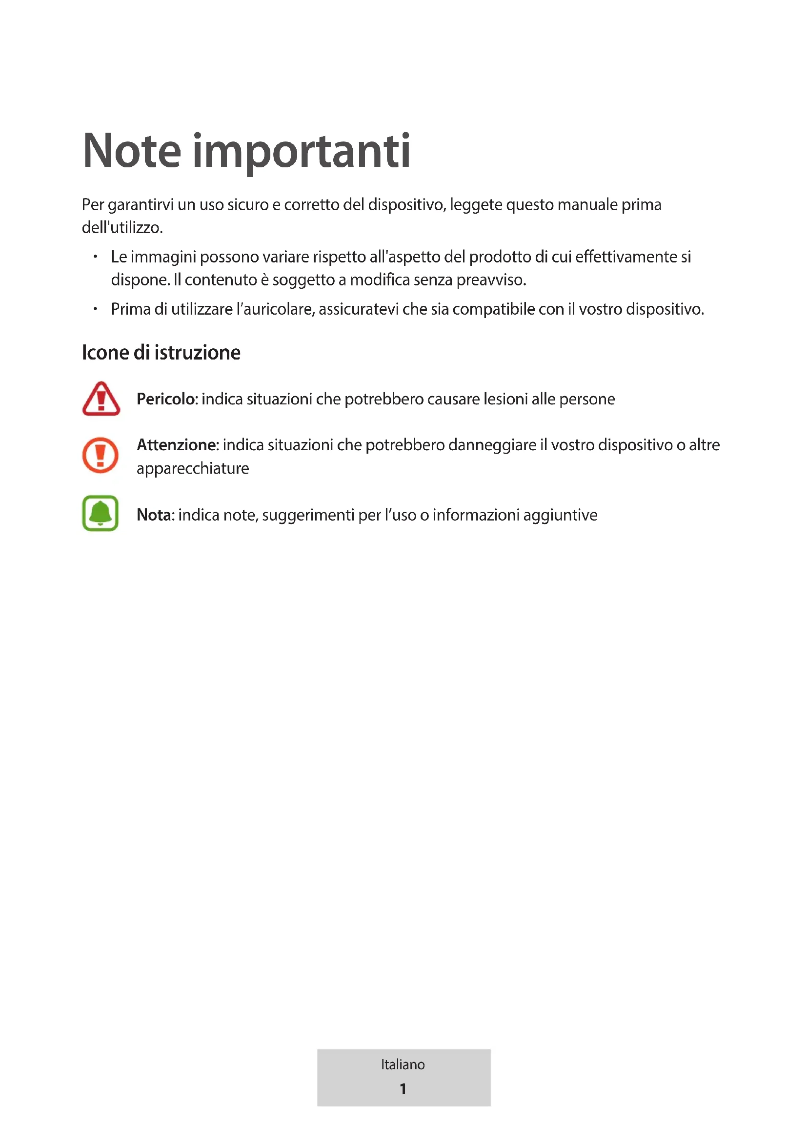 Prima di utilizzare l’auricolare, assicuratevi che sia compatibile con il vostro dispositivo. Icone di istruzione Pericolo: indica situazioni che potrebbero causare lesioni alle persone Attenzione: indica situazioni che potrebbero danneggiare il vostro dispositivo o altre apparecchiature Nota: indica note, suggerimenti per l’uso o informazioni aggiuntive2 Italiano Introduzione Contenuto della confezione Controllate che nella confezione siano presenti i seguenti elementi: