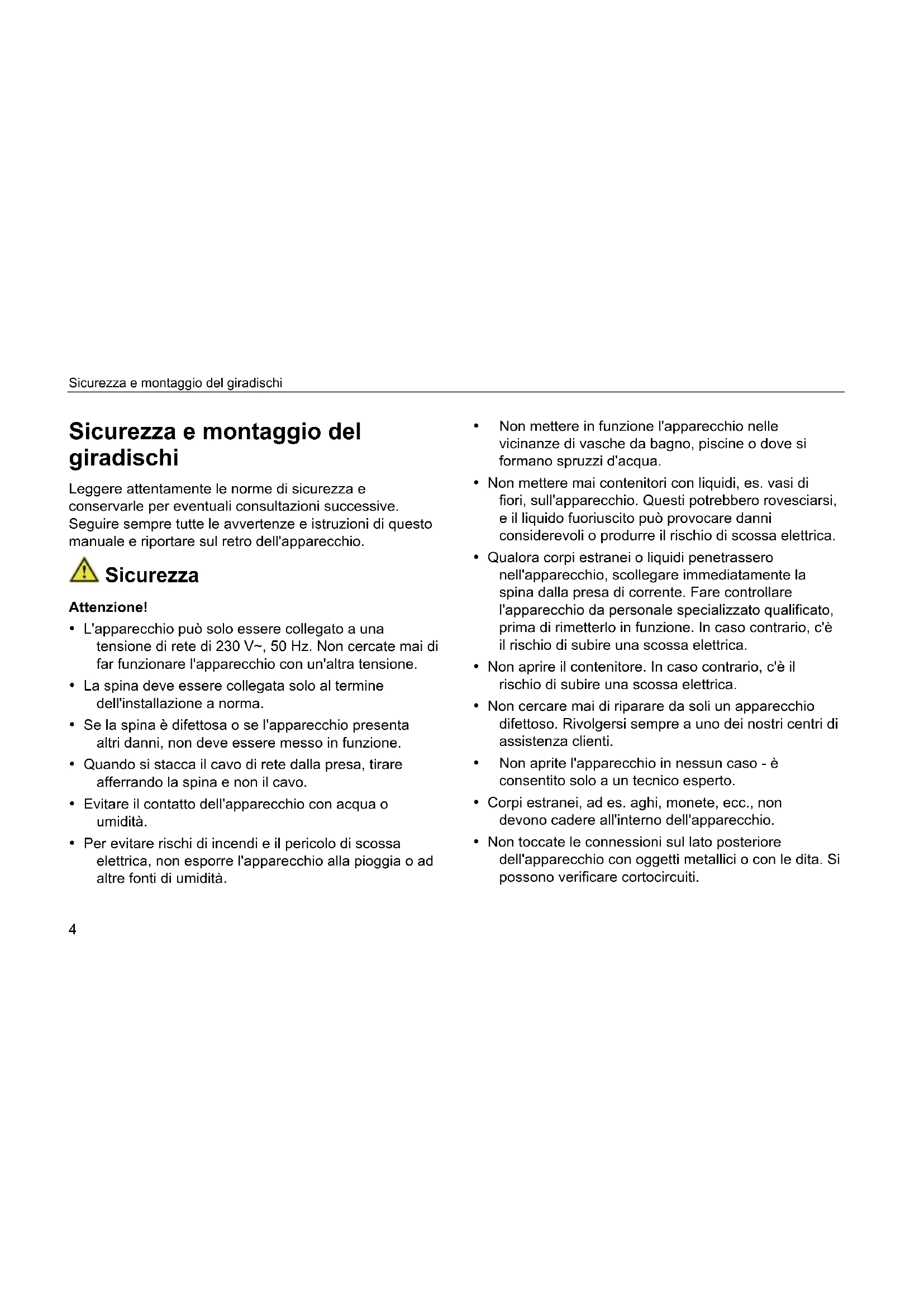 Sicurezza e montaggio del giradischi Leggere attentamente le norme di sicurezza e conservarle per eventuali consultazioni successive. Seguire sempre tutte le avvertenze e istruzioni di questo manuale e riportare sul retro dell'apparecchio. Sicurezza Attenzione! L'apparecchio può solo essere collegato a una tensione di rete di 230 V~, 50 Hz. Non cercate mai di far funzionare l'apparecchio con un'altra tensione. La spina deve essere collegata solo al termine dell'installazione a norma. Se la spina è difettosa o se l'apparecchio presenta altri danni, non deve essere messo in funzione. Quando si stacca il cavo di rete dalla presa, tirare afferrando la spina e non il cavo. Evitare il contatto dell'apparecchio con acqua o umidità. Per evitare rischi di incendi e il pericolo di scossa elettrica, non esporre l'apparecchio alla pioggia o ad altre fonti di umidità. Non mettere in funzione l'apparecchio nelle vicinanze di vasche da bagno, piscine o dove si formano spruzzi d'acqua. Non mettere mai contenitori con liquidi, es. vasi di fiori, sull'apparecchio. Questi potrebbero rovesciarsi, e il liquido fuoriuscito può provocare danni considerevoli o produrre il rischio di scossa elettrica. Qualora corpi estranei o liquidi penetrassero nell'apparecchio, scollegare immediatamente la spina dalla presa di corrente. Fare controllare l'apparecchio da personale specializzato qualificato, prima di rimetterlo in funzione. In caso contrario, c'è il rischio di subire una scossa elettrica. Non aprire il contenitore. In caso contrario, c'è il rischio di subire una scossa elettrica. Non cercare mai di riparare da soli un apparecchio difettoso. Rivolgersi sempre a uno dei nostri centri di assistenza clienti. Non aprite l'apparecchio in nessun caso - è consentito solo a un tecnico esperto. Corpi estranei, ad es. aghi, monete, ecc., non devono cadere all'interno dell'apparecchio. Non toccate le connessioni sul lato posteriore dell'apparecchio con oggetti metallici o con le dita. Si possono verificare cortocircuiti.Sicurezza e montaggio del giradischi