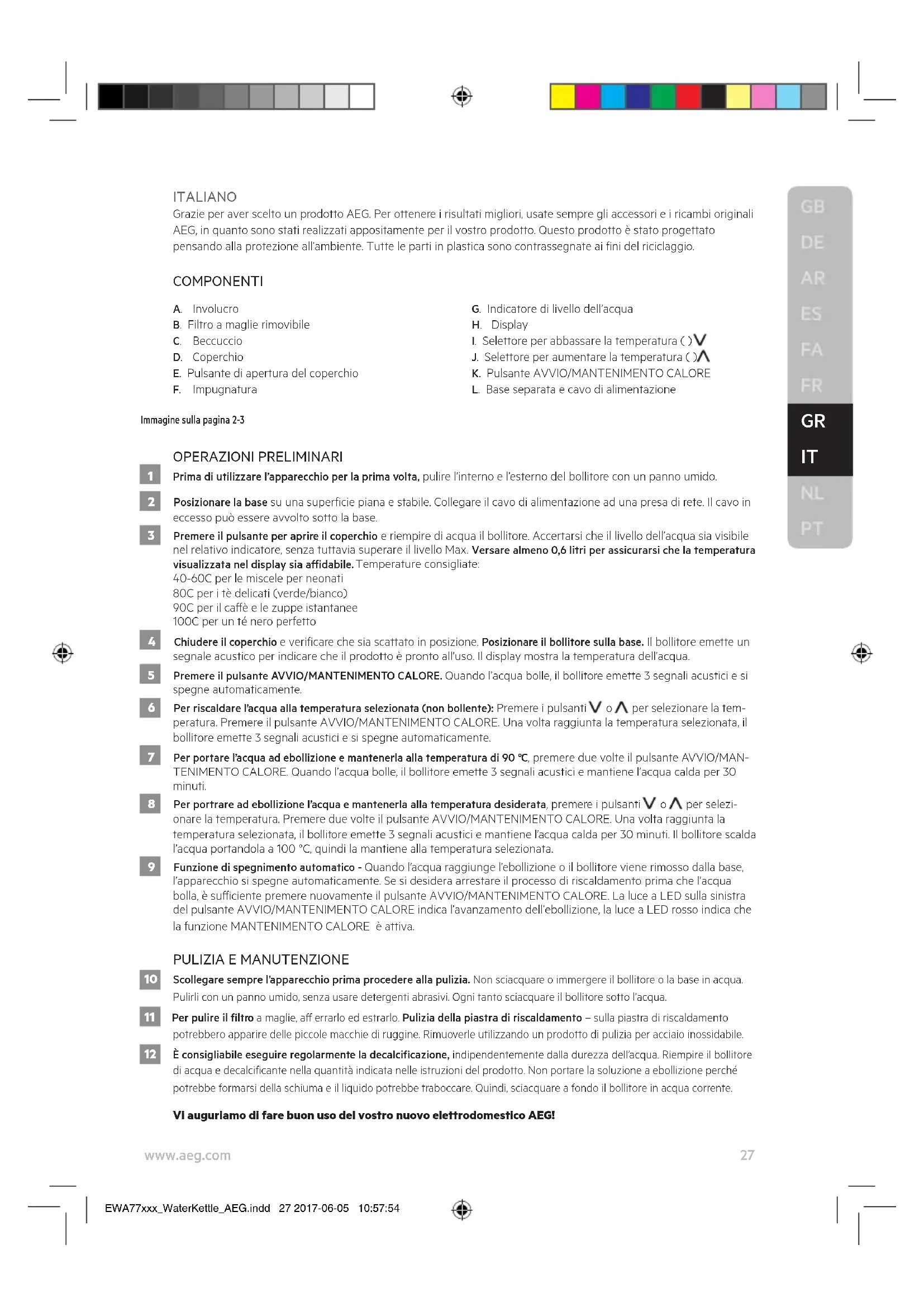 10 Scollegare sempre l’apparecchio prima procedere alla pulizia. Non sciacquare o immergere il bollitore o la base in acqua. Pulirli con un panno umido, senza usare detergenti abrasivi. Ogni tanto sciacquare il bollitore sotto l’acqua. 11 Per pulire il ltro a maglie, a errarlo ed estrarlo. Pulizia della piastra di riscaldamento – sulla piastra di riscaldamento potrebbero apparire delle piccole macchie di ruggine. Rimuoverle utilizzando un prodotto di pulizia per acciaio inossidabile. 12 È consigliabile eseguire regolarmente la decalcicazione, indipendentemente dalla durezza dell’acqua. Riempire il bollitore di acqua e decalcicante nella quantità indicata nelle istruzioni del prodotto. Non portare la soluzione a ebollizione perché potrebbe formarsi della schiuma e il liquido potrebbe traboccare. Quindi, sciacquare a fondo il bollitore in acqua corrente. Vi auguriamo di fare buon uso del vostro nuovo elettrodomestico AEG! EWA77xxx_WaterKettle_AEG.indd 27 2017-06-05 10:57:5428 www.aeg.com