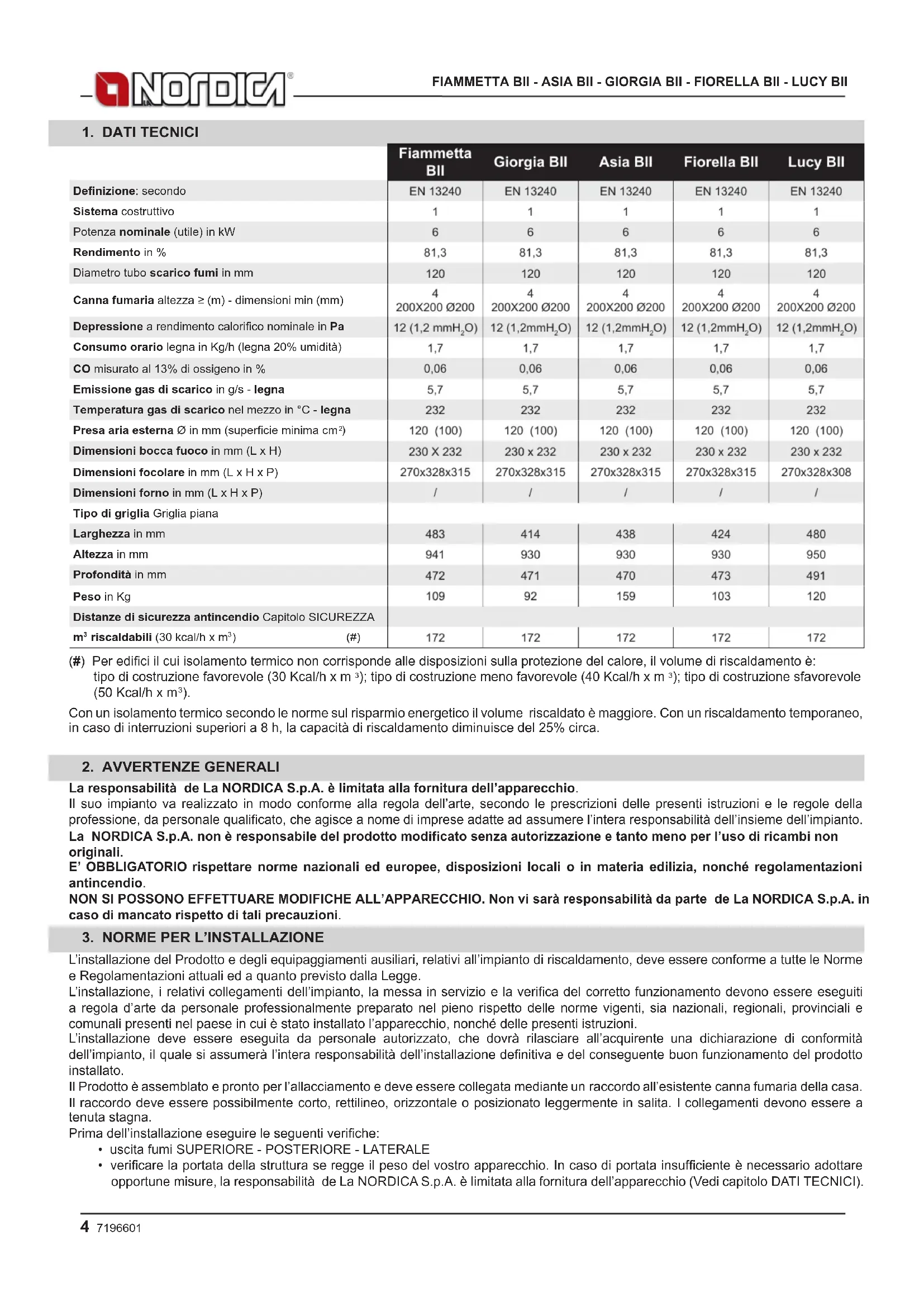 - vericare la portata della struttura se regge il peso del vostro apparecchio. In caso di portata insufciente è necessario adottare opportune misure, la responsabilità de La NORDICA S.p.A. è limitata alla fornitura dell’apparecchio (Vedi capitolo DATI TECNICI). Fiammetta BII Giorgia BII Asia BII Fiorella BII Lucy BII EN 13240 EN 13240 EN 13240 EN 13240 EN 13240