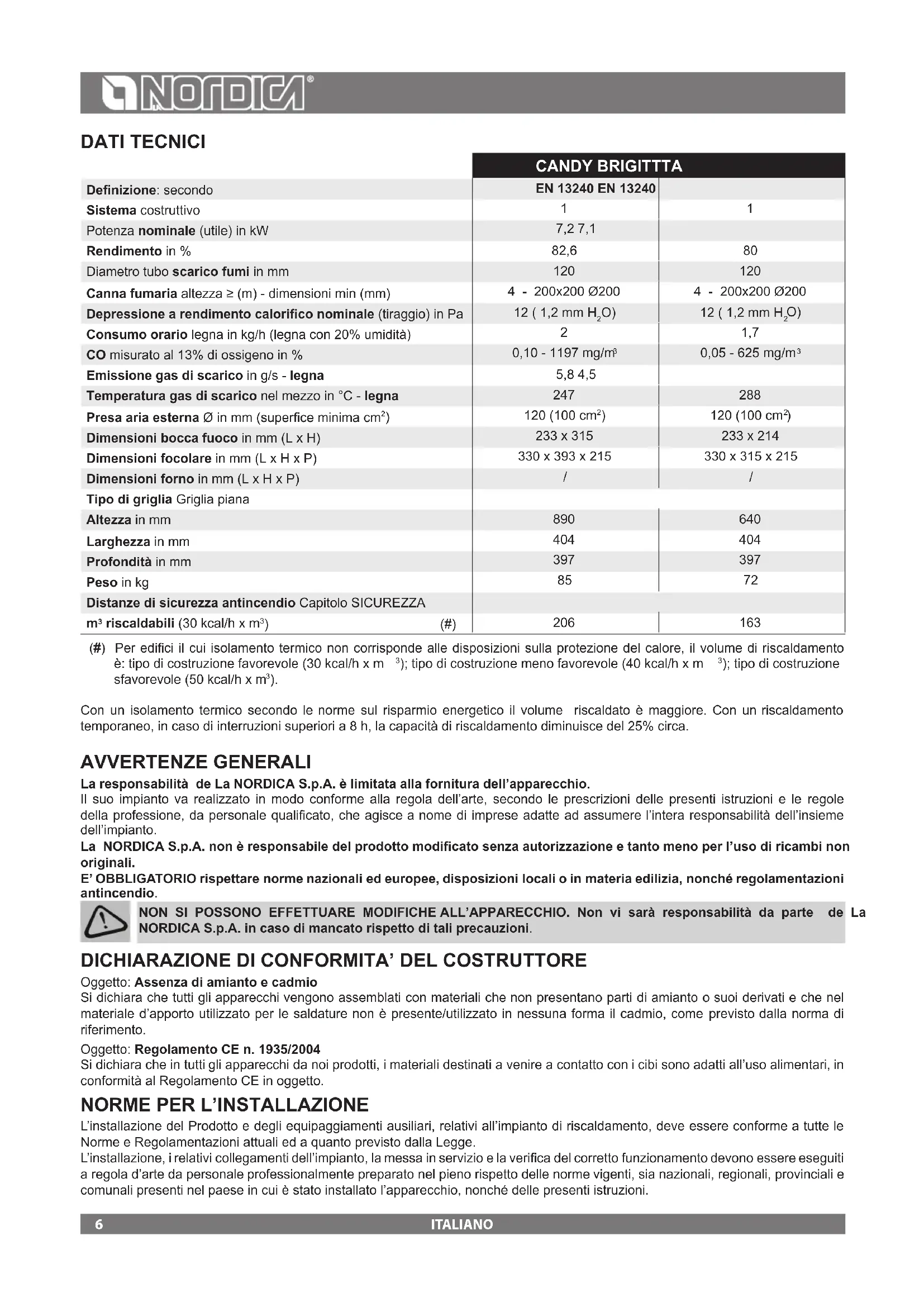 Con un isolamento termico secondo le norme sul risparmio energetico il volume riscaldato è maggiore. Con un riscaldamento temporaneo, in caso di interruzioni superiori a 8 h, la capacità di riscaldamento diminuisce del 25% circa. AVVERTENZE GENERALI La responsabilità de La NORDICA S.p.A. è limitata alla fornitura dell’apparecchio. Il suo impianto va realizzato in modo conforme alla regola dell’arte, secondo le prescrizioni delle presenti istruzioni e le regole della professione, da personale qualicato, che agisce a nome di imprese adatte ad assumere l’intera responsabilità dell’insieme dell’impianto. La NORDICA S.p.A. non è responsabile del prodotto modicato senza autorizzazione e tanto meno per l’uso di ricambi non originali. E’ OBBLIGATORIO rispettare norme nazionali ed europee, disposizioni locali o in materia edilizia, nonché regolamentazioni antincendio. NON SI POSSONO EFFETTUARE MODIFICHE ALL’APPARECCHIO. Non vi sarà responsabilità da parte de La NORDICA S.p.A. in caso di mancato rispetto di tali precauzioni.