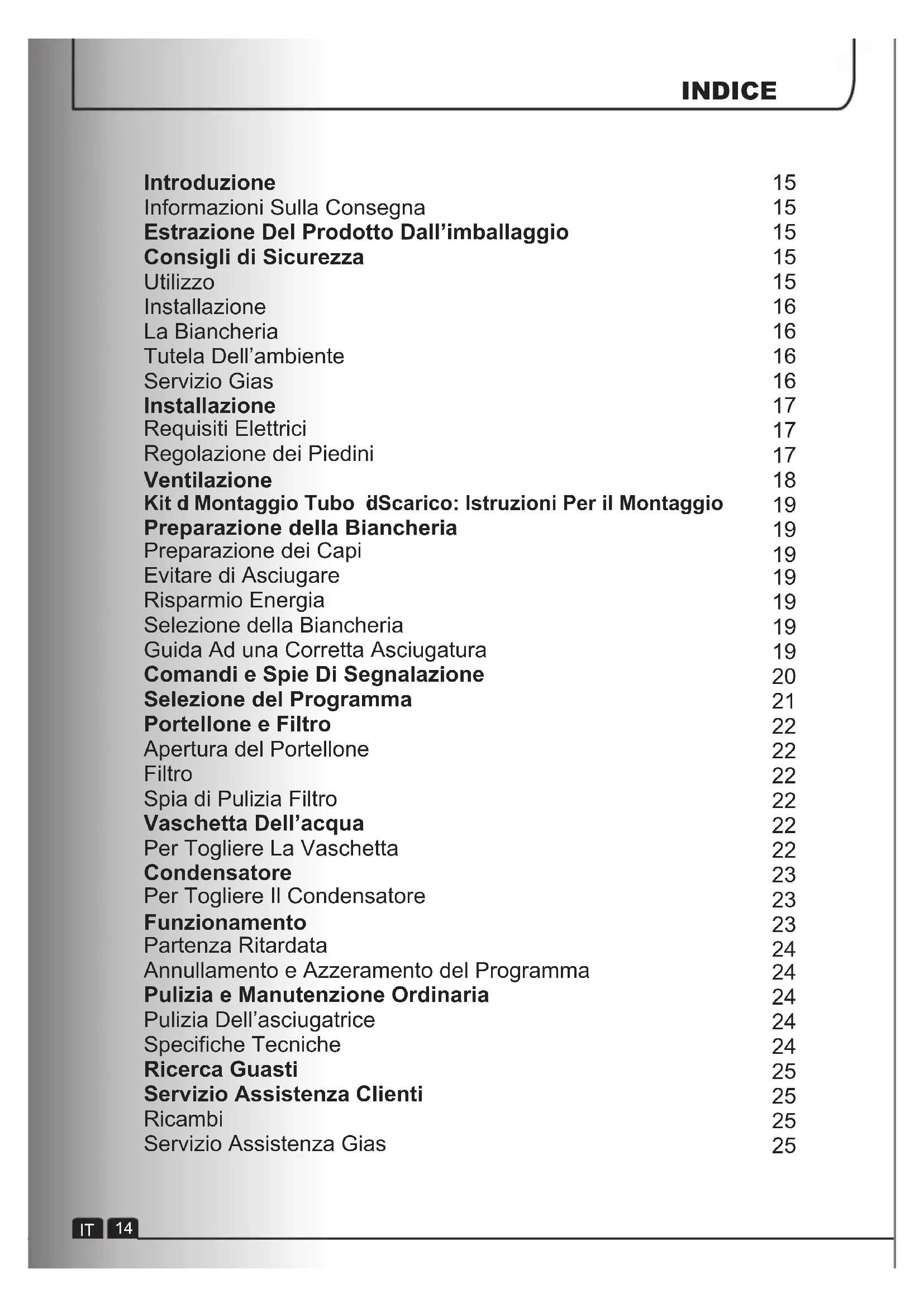 InstallazioneLa Biancheria ● Prima dell’uso, controllare che il prodotto non presenti segni visibili di danni. Non usare in caso di danni e contattare il Servizio Assistenza GIAS. ●Non utilizzare adattatori, connettori multipli e/o prolunghe. ● Non installare l’asciugatrice vicino ai tendaggi e rimuovere tempestivamente eventuali oggetti caduti dietro la macchina. ● L'apparecchio non deve essere installato dietro una porta che può essere chiusa a chiave, una porta scorrevole o una porta i cui cardini siano sul lato opposto rispetto a quelli dell'asciugatrice. ● Non asciugare capi non lavati nell'asciugatrice. ● ATTENZIONE Evitare di asciugare articoli trattati con prodotti di pulizia a secco. ● ATTENZIONE In determinate circostanze, i materiali in gomma possono essere soggetti ad autocombustione se riscaldati. Articoli in gommapiuma (lattice), cuffie da doccia, tessuti impermeabili, articoli in caucciù e vestiti o cuscini imbottiti con gommapiuma NON VANNO asciugati nell'asciugatrice. ● Leggere attentamente le etichette con le istruzioni di lavaggio per conoscere le caratteristiche dell’asciugatura idonea. ● Gli indumenti devono essere introdotti nell’ asci u gat r ice sol o dopo esser e stati opportunamente centrifugati in lavatrice o strizzati a mano. EVITARE di caricare nel cestello indumenti ancora gocciolanti. ● Controllare accuratamente che nelle tasche degli indumenti da asciugare non siano presenti a c c e n d i n i o fia m m i f e r i ed EVITA RE ASSOLUTAMENTE l’uso di prodotti infiammabili in prossimità della macchina. ● Evitare ASSOLUTAMENTE di asciugare tende in fibra di vetro. La contaminazione dei capi con le fibre di vetro può infatti dar luogo a fenomeni d’irritazione cutanea. ● I capi che sono stati macchiati con sostanze come olio da cucina, acetone, alcol, petrolio, cherosene, smacchiatori, acquaragia, cere e sostanze per rimuovere le cere dovrebbero essere lavati in acqua calda con una quantità extra di detergente prima di essere asciugati nell'asciugatrice. ● Gli ammorbidenti o prodotti simili dovrebbero essere utilizzati come specificato nelle rispettive istruzioni ● Tutti i materiali utilizzati per l’imballaggio sono ecologici e riciclabili. Smaltite l’imballaggio con metodi ecologici. Presso il comune di residenza si potranno reperire ulteriori informazioni sui metodi di smaltimento. ● Per garantire la sicurezza al momento dello smaltimento di una asciugatrice, scollegare la spina dell’alimentazione dalla presa, tagliare il cavo dell’alimentazione di rete e distruggerlo insieme alla spina. Per evitare che i bambini possano rimanere intrappolati all'interno della lavatrice, rompere i cardini o la chiusura dell’oblò. Assicurandovi che questo prodotto sia smaltito correttamente, aiuterete ad evitare possibili conseguenze negative all’ambiente e alla salute delle persone, che potrebbero verificarsi a causa d’un errato trattamento di questo prodotto giunto a fine vita.Il simbolo sul prodotto indica che questo apparecchio non può essere trattato come un normale rifiuto domestico; dovrà invece essere consegnato al punto più vicino di raccolta per il riciclo delle apparecchiature elettriche ed elettroniche. Lo smaltimento deve essere effettuato in accordo con le regole ambientali vigenti per lo smaltimento dei rifiuti. Per informazioni più dettagliate sul trattamento, recupero e riciclo di questo prodotto, per favore contattare l’ufficio pubblico di competenza (del dipartimento ecologia e ambiente), o il vostro servizio di raccolta rifiuti a domicilio, o il negozio dove avete acquistato il prodotto. Questo elettrodomestico è marcato conformemente alla Direttiva Europea 2002/96/CE sui rifiuti da apparecchiature elettriche ed elettroniche (WEEE).Direttiva Europea 2002/96/CETutela dell’ambienteServizio GIAS Ai fini della durata e del buon funzionamento della macchina, per gli eventuali interventi di assistenza o riparazione consigliamo di rivolgersi esclusivamente al servizio assistenza autorizzato GIAS. Nel caso in cui la macchina non funzioni correttamente o sia fuori uso, spegnere e staccare la spina dalla presa. Per la riparazione, rivolgersi al Centro Assistenza GIAS.