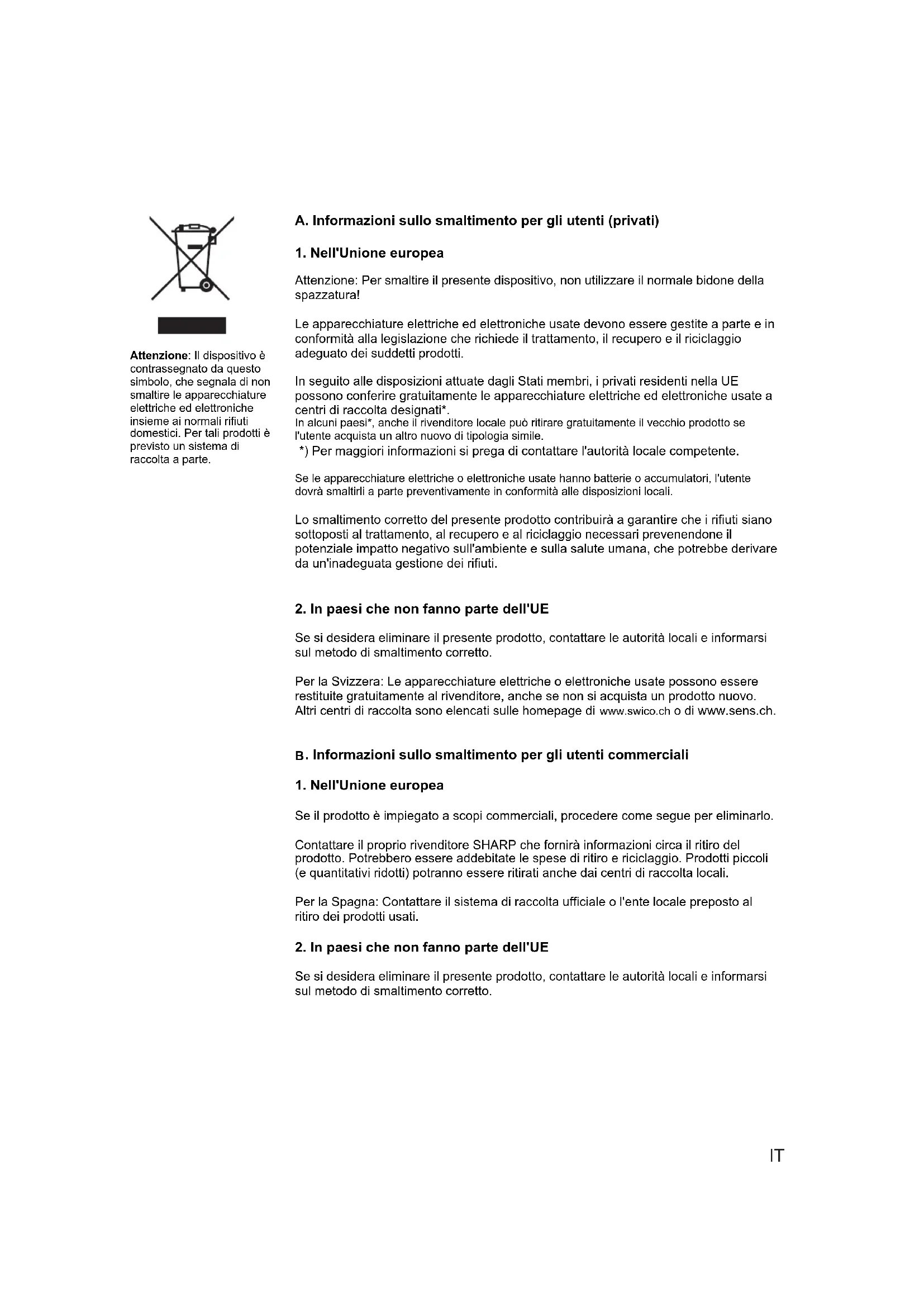 Se il prodotto è impiegato a scopi commerciali, procedere come segue per eliminarlo. Contattare il proprio rivenditore SHARP che fornirà informazioni circa il ritiro del prodotto. Potrebbero essere addebitate le spese di ritiro e riciclaggio. Prodotti piccoli (e quantitativi ridotti) potranno essere ritirati anche dai centri di raccolta locali. Per la Spagna: Contattare il sistema di raccolta ufficiale o l'ente locale preposto al ritiro dei prodotti usati.
