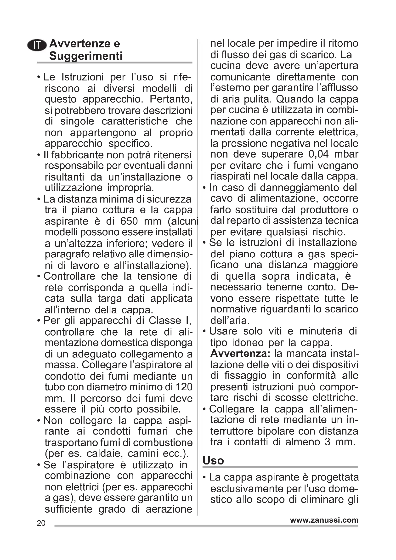 - La cappa aspirante è progettata esclusivamente per l’uso dome- stico allo scopo di eliminare gli IT21 www.zanussi.com odori dalla cucina.