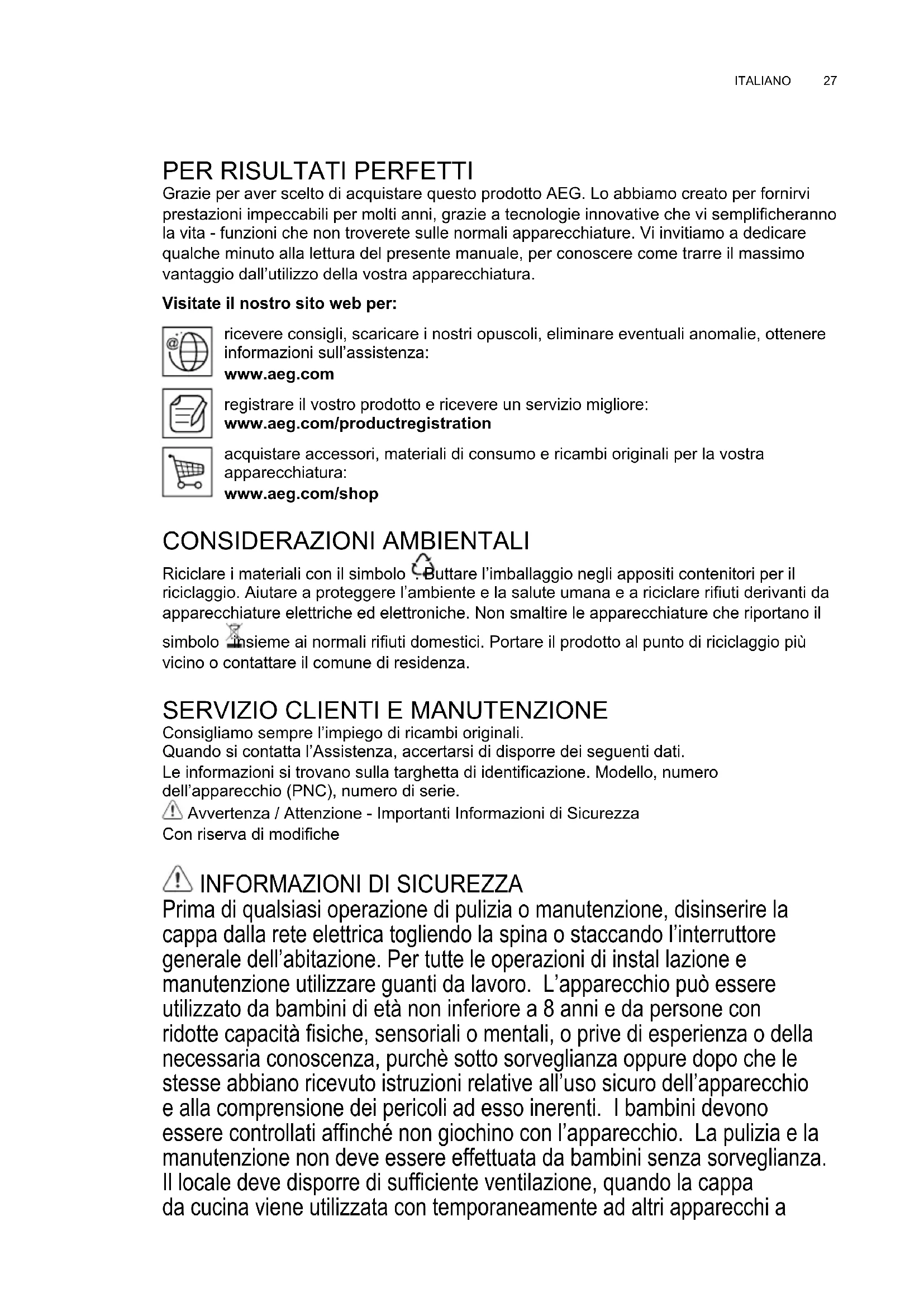 Grazie per aver scelto di acquistare questo prodotto AEG. Lo abbiamo creato per fornirvi prestazioni impeccabili per molti anni, grazie a tecnologie innovative che vi semplicheranno la vita - funzioni che non troverete sulle normali apparecchiature. Vi invitiamo a dedicare qualche minuto alla lettura del presente manuale, per conoscere come trarre il massimo vantaggio dall’utilizzo della vostra apparecchiatura. Visitate il nostro sito web per: ricevere consigli, scaricare i nostri opuscoli, eliminare eventuali anomalie, ottenere informazioni sull’assistenza: www.aeg.com registrare il vostro prodotto e ricevere un servizio migliore: www.aeg.com/productregistration acquistare accessori, materiali di consumo e ricambi originali per la vostra apparecchiatura: www.aeg.com/shop CONSIDERAZIONI AMBIENTALI Riciclare i materiali con il simbolo . Buttare l’imballaggio negli appositi contenitori per il riciclaggio. Aiutare a proteggere l’ambiente e la salute umana e a riciclare riuti derivanti da apparecchiature elettriche ed elettroniche. Non smaltire le apparecchiature che riportano il simbolo insieme ai normali riuti domestici. Portare il prodotto al punto di riciclaggio più vicino o contattare il comune di residenza.