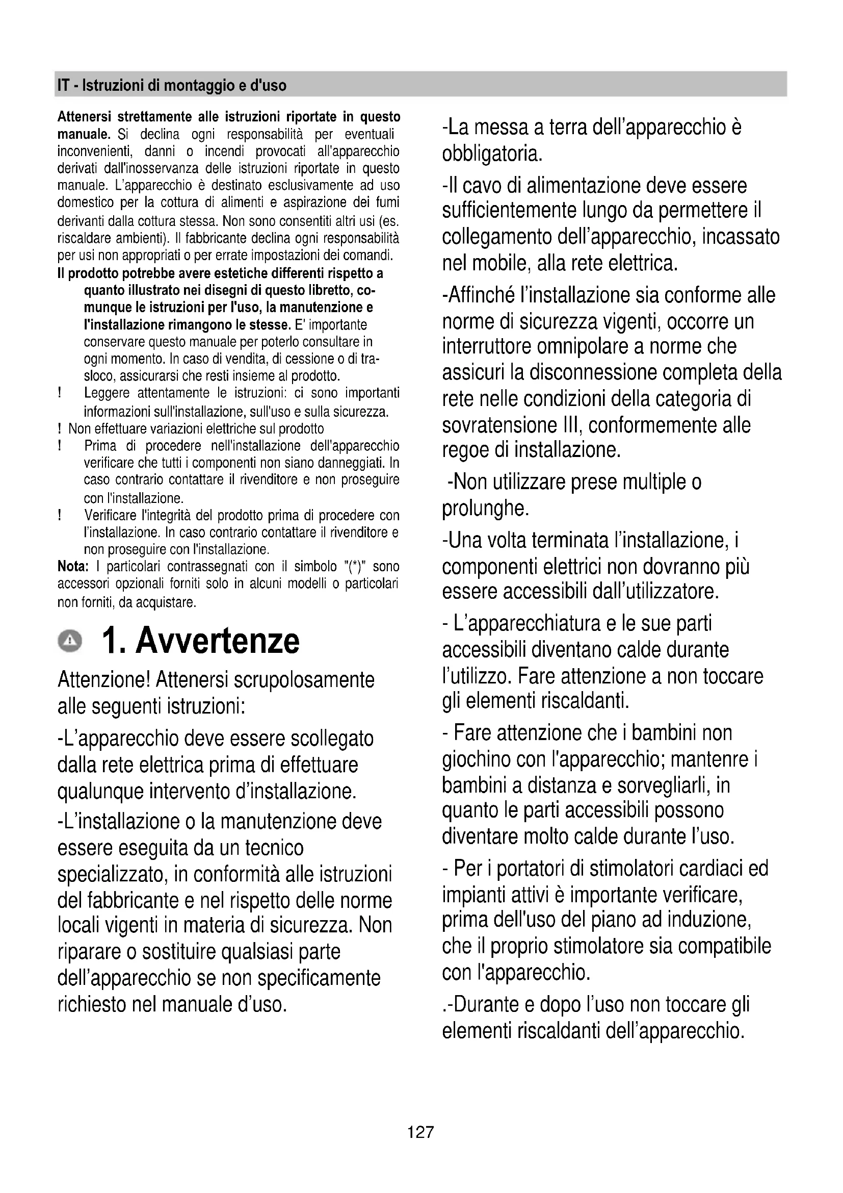 Attenzione! Attenersi scrupolosamente alle seguenti istruzioni: -L’apparecchio deve essere scollegato dalla rete elettrica prima di effettuare qualunque intervento d’installazione. -L’installazione o la manutenzione deve essere eseguita da un tecnico specializzato, in conformità alle istruzioni del fabbricante e nel rispetto delle norme locali vigenti in materia di sicurezza. Non riparare o sostituire qualsiasi parte dell’apparecchio se non specificamente richiesto nel manuale d’uso. -La messa a terra dell’apparecchio è obbligatoria. -Il cavo di alimentazione deve essere sufficientemente lungo da permettere il collegamento dell’apparecchio, incassato nel mobile, alla rete elettrica. -Affinché l’installazione sia conforme alle norme di sicurezza vigenti, occorre un interruttore omnipolare a norme che assicuri la disconnessione completa della rete nelle condizioni della categoria di sovratensione III, conformemente alle regoe di installazione. -Non utilizzare prese multiple o prolunghe. -Una volta terminata l’installazione, i componenti elettrici non dovranno più essere accessibili dall’utilizzatore. - L’apparecchiatura e le sue parti accessibili diventano calde durante l’utilizzo. Fare attenzione a non toccare gli elementi riscaldanti. - Fare attenzione che i bambini non giochino con l'apparecchio; mantenre i bambini a distanza e sorvegliarli, in quanto le parti accessibili possono diventare molto calde durante l’uso. - Per i portatori di stimolatori cardiaci ed impianti attivi è importante verificare, prima dell'uso del piano ad induzione, che il proprio stimolatore sia compatibile con l'apparecchio. .-Durante e dopo l’uso non toccare gli elementi riscaldanti dell’apparecchio.128 -Evitare il contatto con panni o altro materiale infiammabile fino a che tutti i componenti dell’apparecchio non si siano sufficientemente raffreddati. -Non riporre materiale infiammabile sull’apparecchio o nelle sue vicinanze. -I grassi e gli oli surriscaldati prendono facilmente fuoco. Sorvegliare la cottura di alimenti ricchi di grasso e di olio. -Se la superficie è incrinata, spegnere l’apparecchio per evitare la possibilità di scossa elettrica. -L’apparecchio non è destinato ad essere messo in funzione per mezzo di un temporizzatore esterno oppure di un sistema di comando a distanza separato. -La cottura non sorvegliata su un piano cottura con olio o grasso può essere pericolosa e generare incendi. - Il processo di cottura deve essere sorvegliato. Un processo di cottura a breve termine deve essere sorvegliato continuamente. - Non tentare MAI di spegnere le fiamme con acqua. Al contrario, spegnere l’apparecchio e soffocare le fiamme, ad esempio con un coperchio o una coperta antincendio. Pericolo di incendio: non poggiare oggetti sulle superfici di cottura. -Non usare pulitrici a vapore. -Non appoggiare oggetti metallici come coltelli, forchette, cucchiai e coperchi sulla superficie del piano di cottura perché potrebbero surriscaldarsi. - Prima di allacciare il modello alla rete elettrica: controllare la targa dati (posta nella parte inferiore dell'apparecchio) per accertarsi che la tensione e potenza siano corrispondenti a quella della rete e la presa di collegamento sia idonea. In caso di dubbio interpellare un elettricista qualificato. Importante: - Dopo l'uso, spegnere il piano di cottura tramite il suo dispositivo di comando e non fare affidamento sul rivelatore di pentole. - Evitare le fuoriuscite di liquido, pertanto per bollire o riscaldare liquidi, ridurre l’alimentazione di calore. - Non lasciare gli elementi riscaldanti accesi con pentole e padelle vuote oppure senza recipienti. - Una volta terminato di cucinare, spegnere la relativa zona. - Per la cottura non utilizzate mai dei fogli di carta d'alluminio, oppure non posate mai direttamente dei prodotti imballati con alluminio. L'alluminio fonderebbe e danneggerebbe irrimediabilmente il vostro apparecchio. - Non riscaldare mai una scatoletta o un barattolo di latta contenente alimenti senza prima averlo aperto: potrebbe esplodere! Questa avvertenza si applica a tutti gli altri tipi di piani cottura. - L'utilizzo di una potenza elevata come la funzione Booster non è adatta per il riscaldamento di alcuni liquidi come ad esempio l'olio per friggere. L'eccessivo calore potrebbe essere pericoloso.129 In questi casi si consiglia l'utilizzo di una potenza meno elevata. - l recipienti devono esser posti direttamente sul piano cottura e devono essere centrati. In nessun caso inserire altri oggetti tra la pentola e il piano di cottura. - In situazione di elevate temperature l'apparecchio diminuisce automaticamente il livello di potenza delle zone di cottura. Prima di qualsiasi operazione di pulizia o manutenzione, disinserire il prodotto dalla rete elettrica togliendo la spina o staccando l’interruttore generale dell’abitazione. Per tutte le operazioni di installazione e manutenzione utilizzare guanti da lavoro. L’apparecchio può essere utilizzato da bambini di età non inferiore a 8 anni e da persone con ridotte capacità fisiche, sensoriali o mentali, o prive di esperienza o della necessaria conoscenza, purchè sotto sorveglianza oppure dopo che le stesse abbiano ricevuto istruzioni relative all’uso sicuro dell’apparecchio e alla comprensione dei pericoli ad esso inerenti. I bambini devono essere controllati affinché non giochino con l’apparecchio. La pulizia e la manutenzione non deve essere effettuata da bambini senza sorveglianza. Il locale deve disporre di sufficiente ventilazione, quando la cappa da cucina viene utilizzata contemporaneamente ad altri apparecchi a combustione di gas o altri combustibili. La cappa va frequentemente pulita sia internamente che esternamente (ALMENO UNA VOLTA AL MESE), rispettare comunque quanto espressamente indicato nelle istruzioni di manutenzione. L’inosservanza delle norme di pulizia della cappa e della sostituzione e pulizia dei filtri comporta ris