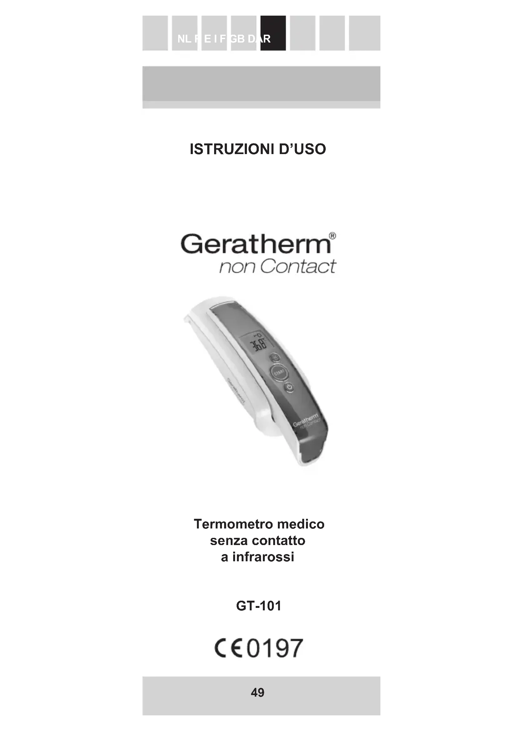 La ringraziamo per la fi ducia accordata a Geratherm e ci congratuliamo per il Suo acquisto! Acquistando Geratherm non Contact, Lei ha optato per un prodotto Geratherm di qualità. Questo termometro è clinicamente testato ed è stato provato essere sicuro ed accurato se utilizzato in conformità a quanto riportato in quello manuale d'istruzioni.
