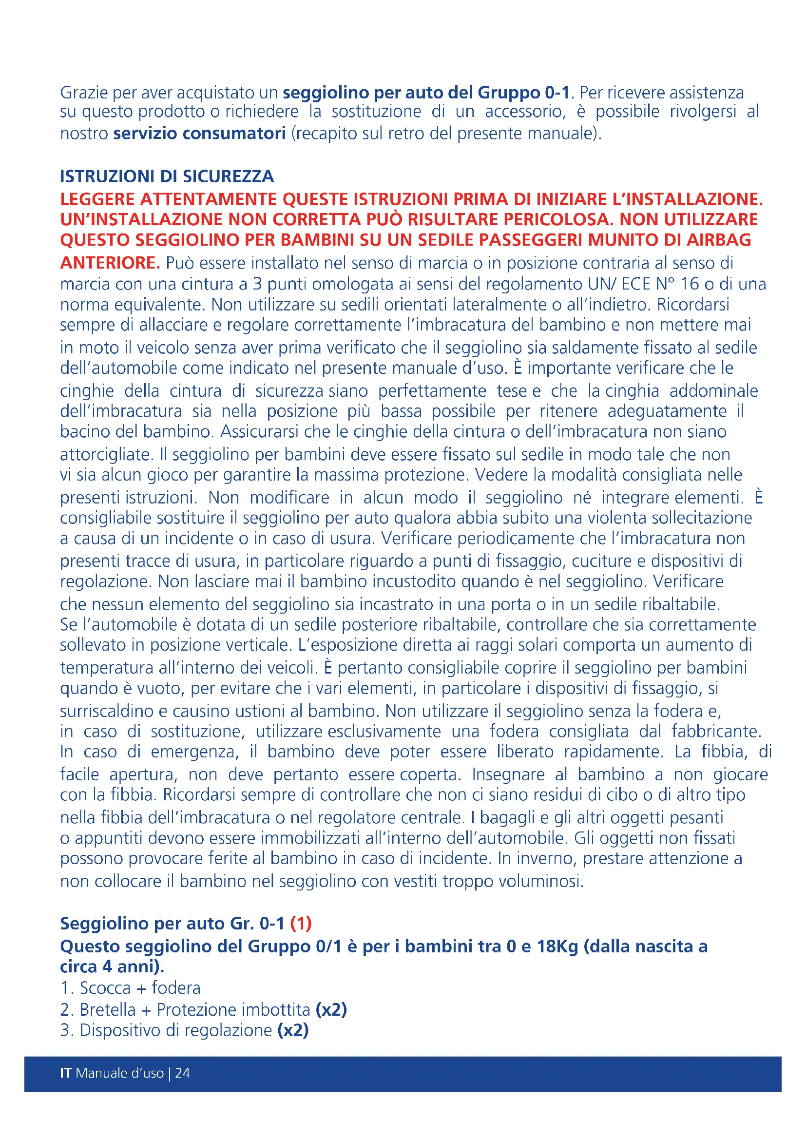 LEGGERE ATTENTAMENTE QUESTE ISTRUZIONI PRIMA DI INIZIARE L’INSTALLAZIONE. UN’INSTALLAZIONE NON CORRETTA PUÒ RISULTARE PERICOLOSA. NON UTILIZZARE QUESTO SEGGIOLINO PER BAMBINI SU UN SEDILE PASSEGGERI MUNITO DI AIRBAG ANTERIORE. Può essere installato nel senso di marcia o in posizione contraria al senso di marcia con una cintura a 3 punti omologata ai sensi del regolamento UN/ ECE N° 16 o di una norma equivalente. Non utilizzare su sedili orientati lateralmente o all’indietro. Ricordarsi sempre di allacciare e regolare correttamente l’imbracatura del bambino e non mettere mai in moto il veicolo senza aver prima verificato che il seggiolino sia saldamente fissato al sedile dell’automobile come indicato nel presente manuale d’uso. È importante verificare che le cinghie della cintura di sicurezza siano perfettamente tese e che la cinghia addominale dell’imbracatura sia nella posizione più bassa possibile per ritenere adeguatamente il bacino del bambino. Assicurarsi che le cinghie della cintura o dell’imbracatura non siano attorcigliate. Il seggiolino per bambini deve essere fissato sul sedile in modo tale che non vi sia alcun gioco per garantire la massima protezione. Vedere la modalità consigliata nelle presenti istruzioni. Non modificare in alcun modo il seggiolino né integrare elementi. È consigliabile sostituire il seggiolino per auto qualora abbia subito una violenta sollecitazione a causa di un incidente o in caso di usura. Verificare periodicamente che l’imbracatura non presenti tracce di usura, in particolare riguardo a punti di fissaggio, cuciture e dispositivi di regolazione. Non lasciare mai il bambino incustodito quando è nel seggiolino. Verificare che nessun elemento del seggiolino sia incastrato in una porta o in un sedile ribaltabile. Se l’automobile è dotata di un sedile posteriore ribaltabile, controllare che sia correttamente sollevato in posizione verticale. L’esposizione diretta ai raggi solari comporta un aumento di temperatura all’interno dei veicoli. È pertanto consigliabile coprire il seggiolino per bambini quando è vuoto, per evitare che i vari elementi, in particolare i dispositivi di fissaggio, si surriscaldino e causino ustioni al bambino. Non utilizzare il seggiolino senza la fodera e, in caso di sostituzione, utilizzare esclusivamente una fodera consigliata dal fabbricante. In caso di emergenza, il bambino deve poter essere liberato rapidamente. La fibbia, di facile apertura, non deve pertanto essere coperta. Insegnare al bambino a non giocare con la fibbia. Ricordarsi sempre di controllare che non ci siano residui di cibo o di altro tipo nella fibbia dell’imbracatura o nel regolatore centrale. I bagagli e gli altri oggetti pesanti o appuntiti devono essere immobilizzati all’interno dell’automobile. Gli oggetti non fissati possono provocare ferite al bambino in caso di incidente. In inverno, prestare attenzione a non collocare il bambino nel seggiolino con vestiti troppo voluminosi. Seggiolino per auto Gr. 0-1 (1) Questo seggiolino del Gruppo 0/1 è per i bambini tra 0 e 18Kg (dalla nascita a circa 4 anni).