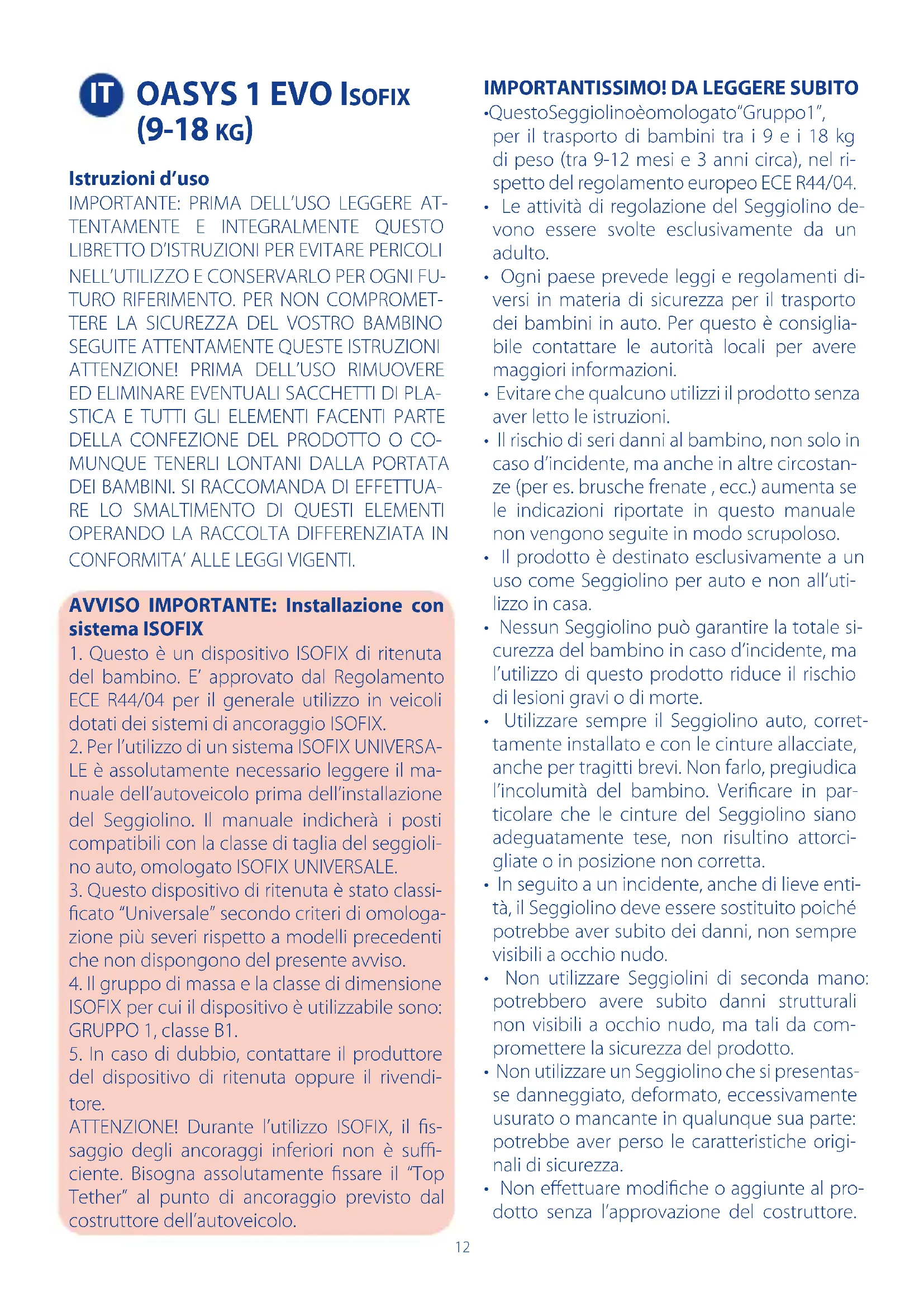 (9-18 KG) Istruzioni d’uso