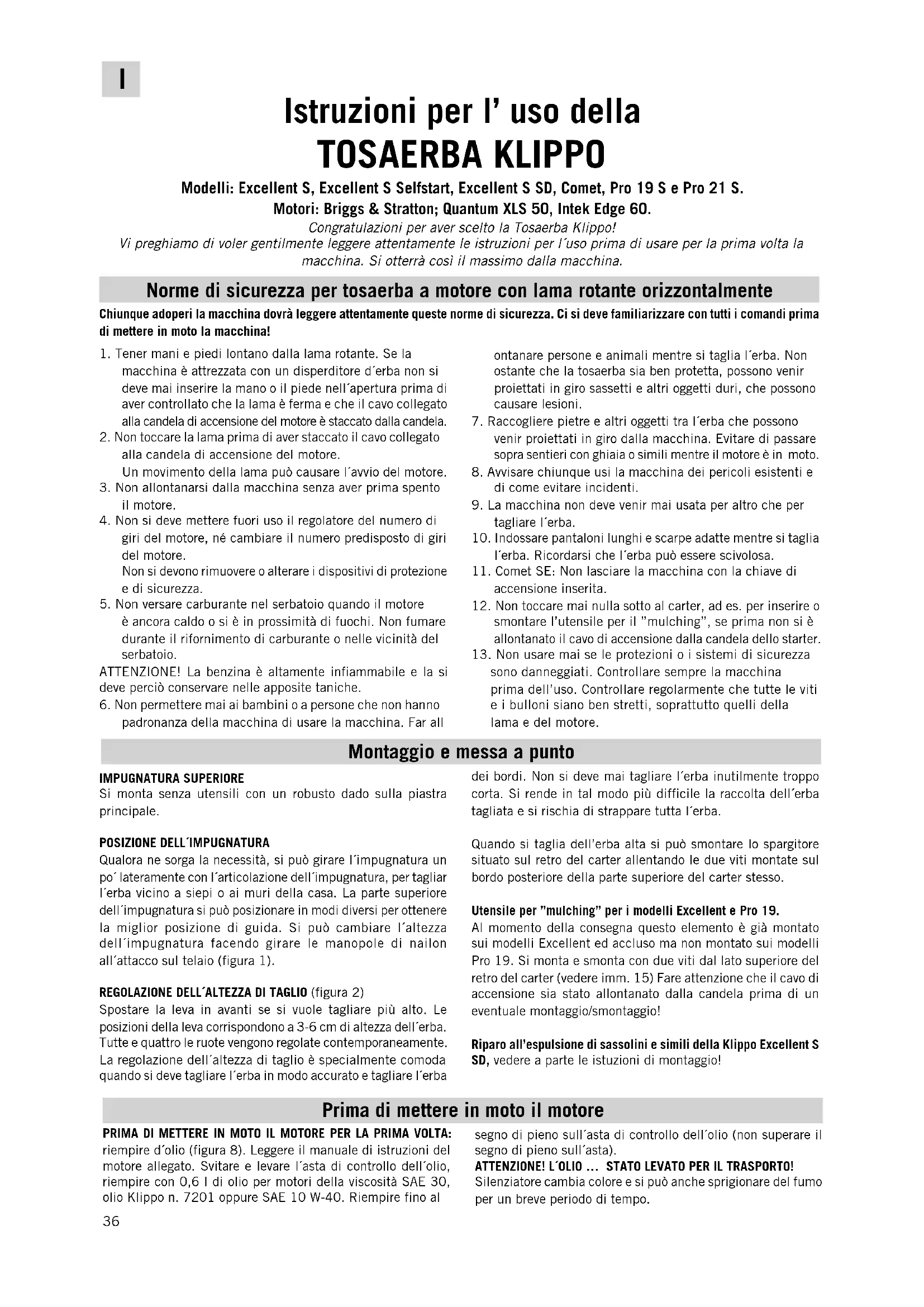 Istruzioni per l’ uso della TOSAERBA KLIPPO Modelli: Excellent S, Excellent S Selfstart, Excellent S SD, Comet, Pro 19 S e Pro 21 S. Motori: Briggs & Stratton; Quantum XLS 50, Intek Edge 60. Congratulazioni per aver scelto la Tosaerba Klippo!Vi preghiamo di voler gentilmente leggere attentamente le istruzioni per l´uso prima di usare per la prima volta lamacchina. Si otterrà così il massimo dalla macchina. Norme di sicurezza per tosaerba a motore con lama rotante orizzontalmente Chiunque adoperi la macchina dovrà leggere attentamente queste norme di sicurezza. Ci si deve familiarizzare con tutti i comandi prima di mettere in moto la macchina! Montaggio e messa a punto Prima di mettere in moto il motore 1. Tener mani e piedi lontano dalla lama rotante. Se lamacchina è attrezzata con un disperditore d´erba non sideve mai inserire la mano o il piede nell´apertura prima diaver controllato che la lama è ferma e che il cavo collegatoalla candela di accensione del motore è staccato dalla candela.2. Non toccare la lama prima di aver staccato il cavo collegatoalla candela di accensione del motore.Un movimento della lama può causare l´avvio del motore.3. Non allontanarsi dalla macchina senza aver prima spentoil motore.4. Non si deve mettere fuori uso il regolatore del numero digiri del motore, né cambiare il numero predisposto di giridel motore.Non si devono rimuovere o alterare i dispositivi di protezionee di sicurezza.5. Non versare carburante nel serbatoio quando il motoreè ancora caldo o si è in prossimità di fuochi. Non fumaredurante il rifornimento di carburante o nelle vicinità delserbatoio.ATTENZIONE! La benzina è altamente infiammabile e la sideve perciò conservare nelle apposite taniche.6. Non permettere mai ai bambini o a persone che non hannopadronanza della macchina di usare la macchina. Far allontanare persone e animali mentre si taglia l´erba. Nonostante che la tosaerba sia ben protetta, possono venirproiettati in giro sassetti e altri oggetti duri, che possonocausare lesioni.7. Raccogliere pietre e altri oggetti tra l´erba che possonovenir proiettati in giro dalla macchina. Evitare di passaresopra sentieri con ghiaia o simili mentre il motore è in moto.8. Avvisare chiunque usi la macchina dei pericoli esistenti edi come evitare incidenti.9. La macchina non deve venir mai usata per altro che pertagliare l´erba.10. Indossare pantaloni lunghi e scarpe adatte mentre si taglial´erba. Ricordarsi che l´erba può essere scivolosa.11. Comet SE: Non lasciare la macchina con la chiave diaccensione inserita.12. Non toccare mai nulla sotto al carter, ad es. per inserire osmontare l’utensile per il ”mulching”, se prima non si èallontanato il cavo di accensione dalla candela dello starter.13. Non usare mai se le protezioni o i sistemi di sicurezzasono danneggiati. Controllare sempre la macchinaprima dell’uso. Controllare regolarmente che tutte le vitie i bulloni siano ben stretti, soprattutto quelli dellalama e del motore.IMPUGNATURA SUPERIORESi monta senza utensili con un robusto dado sulla piastraprincipale.POSIZIONE DELL´IMPUGNATURAQualora ne sorga la necessità, si può girare l´impugnatura unpo´ lateramente con l´articolazione dell´impugnatura, per tagliarl´erba vicino a siepi o ai muri della casa. La parte superioredell´impugnatura si può posizionare in modi diversi per ottenerela miglior posizione di guida. Si può cambiare l´altezzadell´impugnatura facendo girare le manopole di nailonall´attacco sul telaio (figura 1).REGOLAZIONE DELL´ALTEZZA DI TAGLIO (figura 2)Spostare la leva in avanti se si vuole tagliare più alto. Leposizioni della leva corrispondono a 3-6 cm di altezza dell´erba.Tutte e quattro le ruote vengono regolate contemporaneamente.La regolazione dell´altezza di taglio è specialmente comodaquando si deve tagliare l´erba in modo accurato e tagliare l´erbadei bordi. Non si deve mai tagliare l´erba inutilmente troppocorta. Si rende in tal modo più difficile la raccolta dell´erbatagliata e si rischia di strappare tutta l´erba.Quando si taglia dell’erba alta si può smontare lo spargitoresituato sul retro del carter allentando le due viti montate sulbordo posteriore della parte superiore del carter stesso.Utensile per ”mulching” per i modelli Excellent e Pro 19.Al momento della consegna questo elemento è già montatosui modelli Excellent ed accluso ma non montato sui modelliPro 19. Si monta e smonta con due viti dal lato superiore delretro del carter (vedere imm. 15) Fare attenzione che il cavo diaccensione sia stato allontanato dalla candela prima di uneventuale montaggio/smontaggio!Riparo all’espulsione di sassolini e simili della Klippo Excellent SSD, vedere a parte le istuzioni di montaggio!PRIMA DI METTERE IN MOTO IL MOTORE PER LA PRIMA VOLTA:riempire d´olio (figura 8). Leggere il manuale di istruzioni delmotore allegato. Svitare e levare l´asta di controllo dell´olio,riempire con 0,6 l di olio per motori della viscosità SAE 30,olio Klippo n. 7201 oppure SAE 10 W-40. Riempire fino alsegno di pieno sull´asta di controllo dell´olio (non superare ilsegno di pieno sull´asta).ATTENZIONE! L´OLIO … STATO LEVATO PER IL TRASPORTO!Silenziatore cambia colore e si può anche sprigionare del fumoper un breve periodo di tempo.37