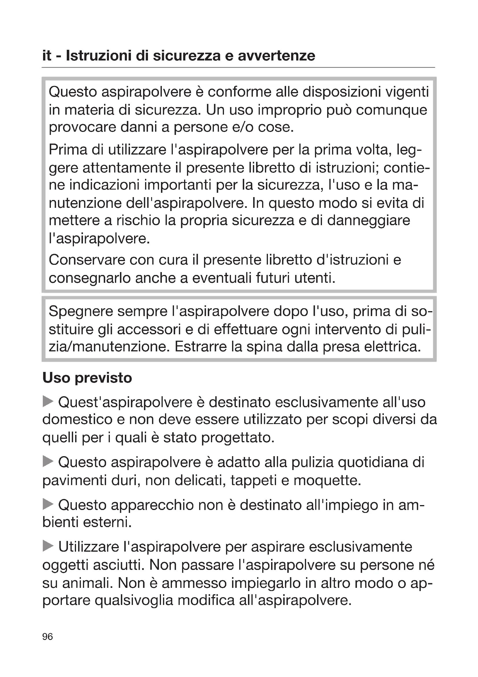 Questo aspirapolvere è conforme alle disposizioni vigenti in materia di sicurezza. Un uso improprio può comunque provocare danni a persone e/o cose. Prima di utilizzare l'aspirapolvere per la prima volta, leg- gere attentamente il presente libretto di istruzioni; contie- ne indicazioni importanti per la sicurezza, l'uso e la ma- nutenzione dell'aspirapolvere. In questo modo si evita di mettere a rischio la propria sicurezza e di danneggiare l'aspirapolvere. Conservare con cura il presente libretto d'istruzioni e consegnarlo anche a eventuali futuri utenti. Spegnere sempre l'aspirapolvere dopo l'uso, prima di so- stituire gli accessori e di effettuare ogni intervento di puli- zia/manutenzione. Estrarre la spina dalla presa elettrica. Uso previsto Quest'aspirapolvere è destinato esclusivamente all'uso domestico e non deve essere utilizzato per scopi diversi da quelli per i quali è stato progettato. Questo aspirapolvere è adatto alla pulizia quotidiana di pavimenti duri, non delicati, tappeti e moquette. Questo apparecchio non è destinato all'impiego in am- bienti esterni. Utilizzare l'aspirapolvere per aspirare esclusivamente oggetti asciutti. Non passare l'aspirapolvere su persone né su animali. Non è ammesso impiegarlo in altro modo o ap- portare qualsivoglia modifica all'aspirapolvere.it - Istruzioni di sicurezza e avvertenze