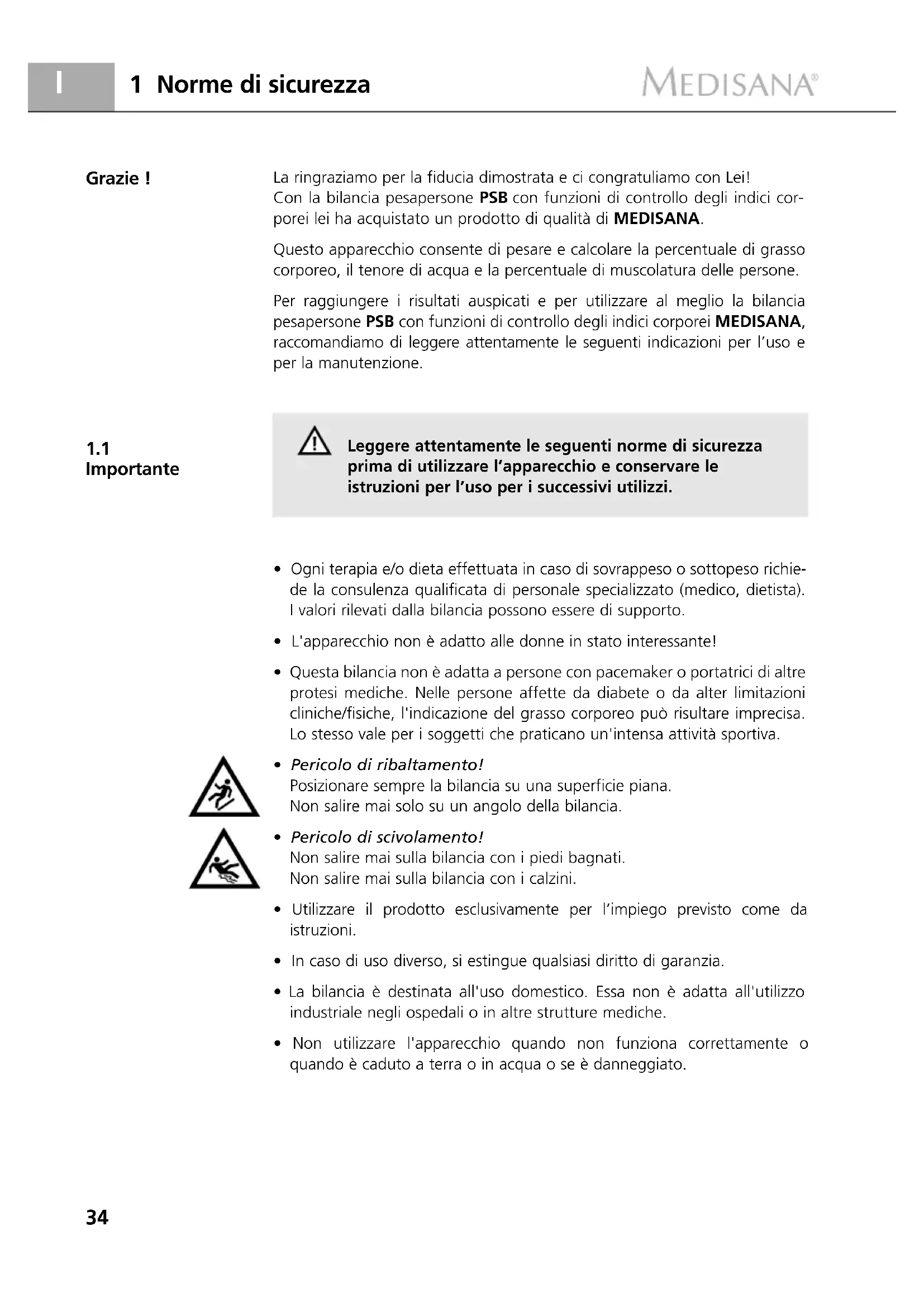 Importante La ringraziamo per la fiducia dimostrata e ci congratuliamo con Lei! Con la bilancia pesapersone PSB con funzioni di controllo degli indici cor- porei lei ha acquistato un prodotto di qualità di MEDISANA. Questo apparecchio consente di pesare e calcolare la percentuale di grasso corporeo, il tenore di acqua e la percentuale di muscolatura delle persone. Per raggiungere i risultati auspicati e per utilizzare al meglio la bilancia pesapersone PSB con funzioni di controllo degli indici corporei MEDISANA, raccomandiamo di leggere attentamente le seguenti indicazioni per l’uso e per la manutenzione. Leggere attentamente le seguenti norme di sicurezza prima di utilizzare l’apparecchio e conservare le istruzioni per l’uso per i successivi utilizzi.