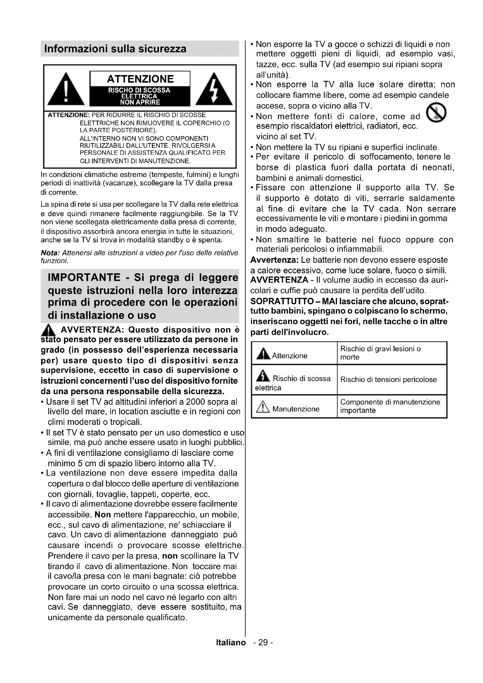 ELETTRICA NON APRIRE ATTENZIONE: PER RIDURRE IL RISCHIO DI SCOSSE ELETTRICHE NON RIMUOVERE IL COPERCHIO (O LA PARTE POSTERIORE). ALL'INTERNO NON VI SONO COMPONENTI RIUTILIZZABILI DALL'UTENTE. RIVOLGERSI PERSONALE DI ASSISTENZA QUALIFICATO PER GLI INTERVENTI DI MANUTENZIONE. Nota: Attenersi alle istruzioni a video per l'uso delle relative funzioni. In condizioni climatiche estreme (tempeste, fulmini) e lunghi periodi di inattività (vacanze), scollegare la TV dalla presa di corrente. La spina di rete si usa per scollegare la TV dalla rete elettrica e deve quindi rimanere facilmente raggiungibile. Se la TV non viene scollegata elettricamente dalla presa di corrente, il dispositivo assorbirà ancora energia in tutte le situazioni, anche se la TV si trova in modalità standby o è spenta. IMPORTANTE - Si prega di leggere queste istruzioni nella loro interezza prima di procedere con le operazioni di installazione o uso AVVERTENZA: Questo dispositivo non è stato pensato per essere utilizzato da persone in grado (in possesso dell’esperienza necessaria per) usare questo tipo di dispositivi senza supervisione, eccetto in caso di supervisione o istruzioni concernenti l’uso del dispositivo fornite da una persona responsabile della sicurezza.