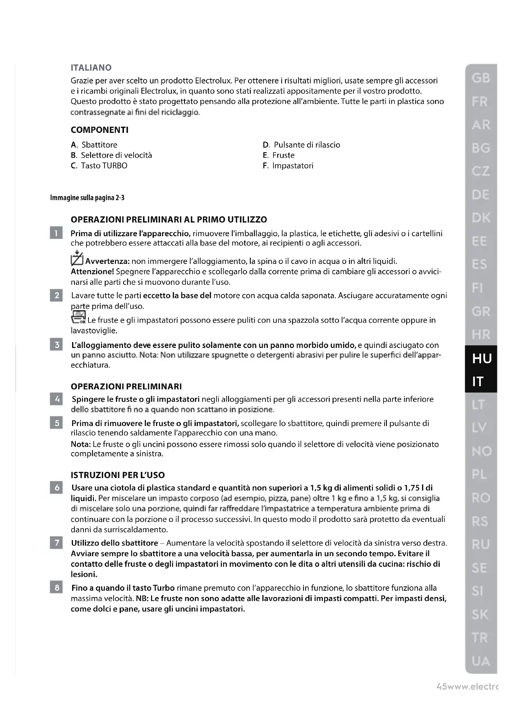 ITALIANO Grazie per aver scelto un prodotto Electrolux. Per ottenere i risultati migliori, usate sempre gli accessori e i ricambi originali Electrolux, in quanto sono stati realizzati appositamente per il vostro prodotto. Questo prodotto è stato progettato pensando alla protezione all’ambiente. Tutte le parti in plastica sono COMPONENTI A. Sbattitore B. Selettore di velocità C. Tasto TURBO D. Pulsante di rilascio E. Fruste F. Impastatori Immagine sulla pagina 2-3
