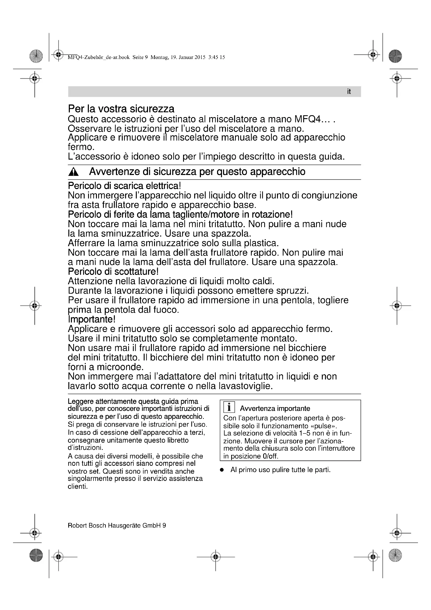 Risque d’électrocution ! Ne plongez pas l’appareil dans l’eau au-delà de la jonction entre l’appareil de base et l’accessoire mixeur rapide. Risque de blessures avec le couteau très aiguisé / l’entraînement rotatif ! Ne touchez jamais la lame de l’accessoire mixeur rapide. Ne nettoyez jamais à mains nues la lame de l’accessoire mixeur. Utilisez une brosse. Risque de brûlure ! Prudence lors du traitement de liquides très chauds. L’appareil risque de provo- quer des projection de liquide. Sous réserve de modifications. MFQ4-Zubehör_de-ar.book Seite 8 Montag, 19. Januar 2015 3:45 15Robert Bosch Hausgeräte GmbH 9 Per la vostra sicurezza Questo accessorio è destinato al miscelatore a mano MFQ4… . Osservare le istruzioni per l’uso del miscelatore a mano. Applicare e rimuovere il miscelatore manuale solo ad apparecchio fermo. L’accessorio è idoneo solo per l’impiego descritto in questa guida. , Avvertenze di sicurezza per questo apparecchio Pericolo di scarica elettrica! Non immergere l’apparecchio nel liquido oltre il punto di congiunzione fra asta frullatore rapido e apparecchio base. Pericolo di ferite da lama tagliente/motore in rotazione! Non toccare mai la lama nel mini tritatutto. Non pulire a mani nude la lama sminuzzatrice. Usare una spazzola. Afferrare la lama sminuzzatrice solo sulla plastica. Non toccare mai la lama dell’asta frullatore rapido. Non pulire mai a mani nude la lama dell’asta del frullatore. Usare una spazzola. Pericolo di scottature! Attenzione nella lavorazione di liquidi molto caldi. Durante la lavorazione i liquidi possono emettere spruzzi. Per usare il frullatore rapido ad immersione in una pentola, togliere prima la pentola dal fuoco. Importante! Applicare e rimuovere gli accessori solo ad apparecchio fermo. Usare il mini tritatutto solo se completamente montato. Non usare mai il frullatore rapido ad immersione nel bicchiere del mini tritatutto. Il bicchiere del mini tritatutto non è idoneo per forni a microonde. Non immergere mai l’adattatore del mini tritatutto in liquidi e non lavarlo sotto acqua corrente o nella lavastoviglie. Leggere attentamente questa guida prima dell’uso, per conoscere importanti istruzioni di sicurezza e per l’uso di questo apparecchio. Si prega di conservare le istruzioni per l’uso. In caso di cessione dell’apparecchio a terzi, consegnare unitamente questo libretto d’istruzioni. A causa dei diversi modelli, è possibile che non tutti gli accessori siano compresi nel vostro set. Questi sono in vendita anche singolarmente presso il servizio assistenza clienti. Al primo uso pulire tutte le parti.