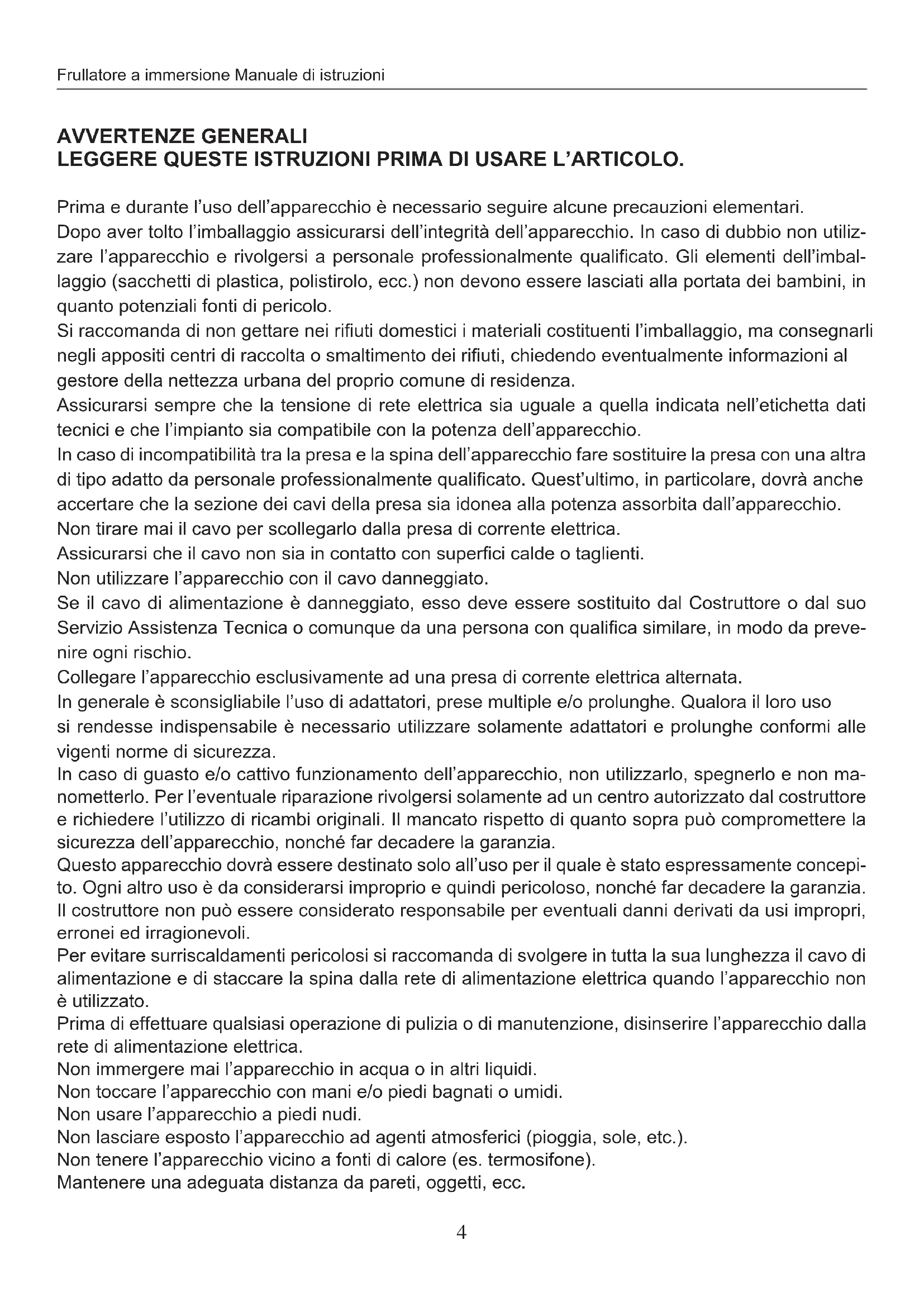 Non utilizzare il frullatore ad immersione con le mani bagnate e/o i piedi nudi.