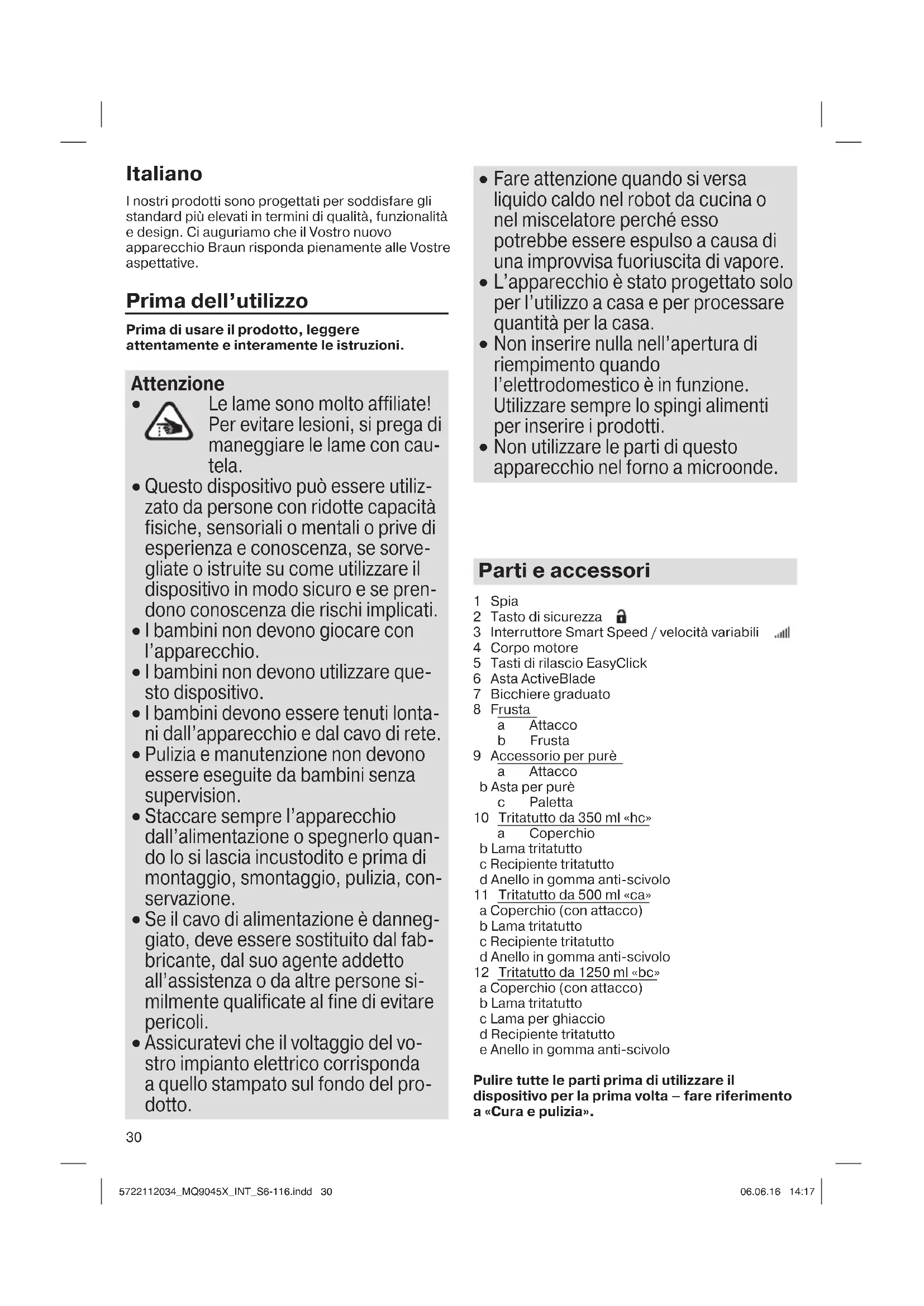 - Durante la lavorazione di cibi ad alta concentrazione di pigmento (ad es. carote), gli accessori possono cambiare colore. Strofinare queste parti con olio vegetale prima di pulirle. Le specifiche di progettazione e le presenti istruzioni d’uso sono soggette a modifica senza preavviso. Soggetto a modifiche senza preavviso. Non smaltire il prodotto insieme ai rifiuti domestici quando non più necessario. Il prodotto può essere smaltito presso un centro di assistenza Braun o un centro di raccolta adatto del proprio paese. I materiali e gli oggetti destinati al contatto con prodotti alimentari sono conformi alle prescrizioni del regolamento Europeo 1935/2004. 5722112034_MQ9045X_INT_S6-116.indd 335722112034_MQ9045X_INT_S6-116.indd 33 06.06.16 14:1706.06.16 14:1734 Nederlands Onze producten zijn ontwikkeld om te voldoen aan de strengste normen inzake kwaliteit, functionaliteit en design. Wij hopen van harte dat u geniet van uw nieuw Braun-toestel. Vóór gebruik Lees de handleiding voordat u het apparaat in gebruik neemt in zijn geheel zorgvuldig door. Waarschuwing
