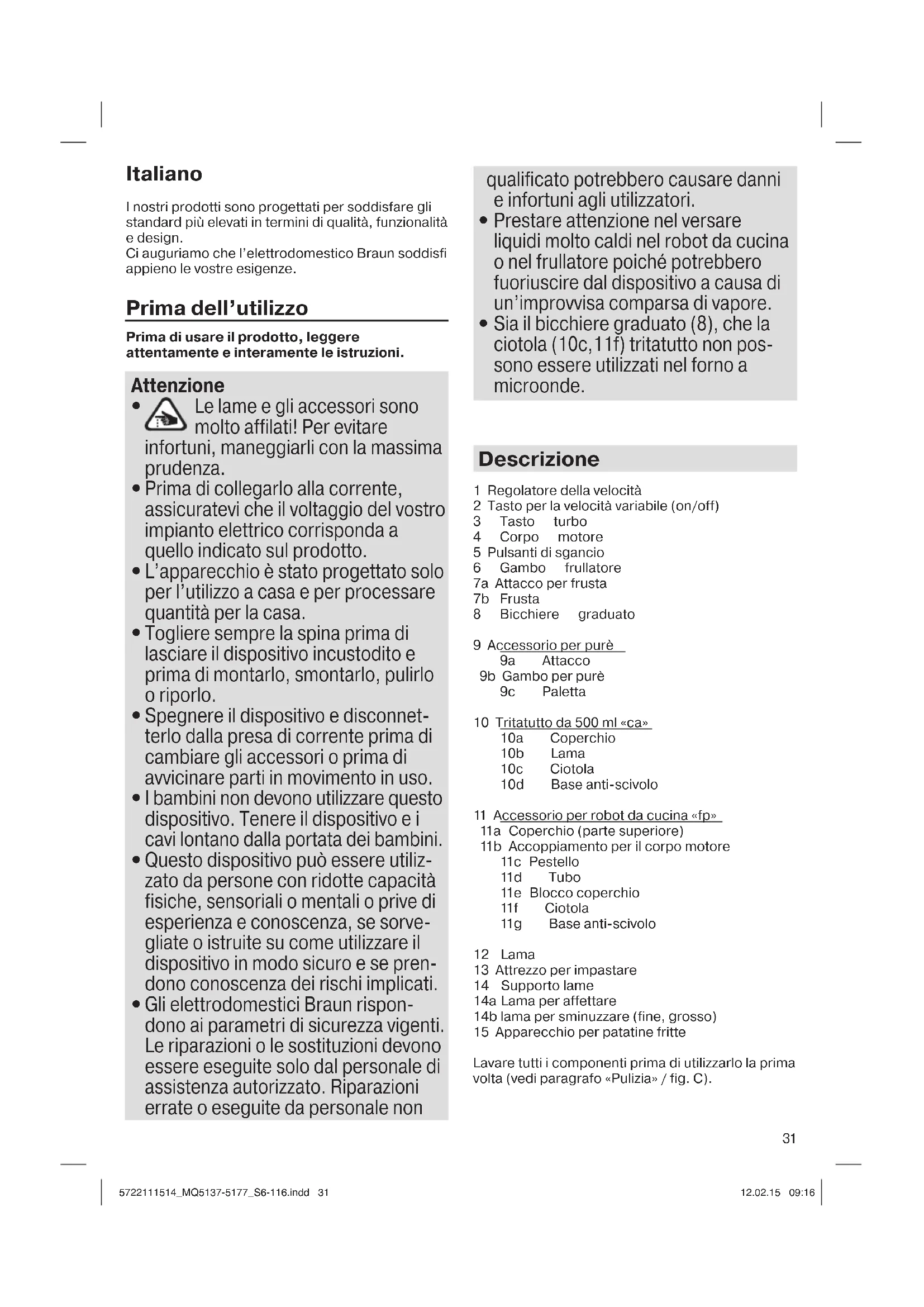 Sia il bicchiere graduato (8), che la ciotola (10c,11f) tritatutto non pos- sono essere utilizzati nel forno a microonde. Descrizione 1 Regolatore della velocità 2 Tasto per la velocità variabile (on/off) 3 Tasto turbo 4 Corpo motore 5 Pulsanti di sgancio 6 Gambo frullatore 7a Attacco per frusta 7b Frusta 8 Bicchiere graduato 9 Accessorio per purè 9a Attacco 9b Gambo per purè 9c Paletta 10 Tritatutto da 500 ml «ca» 10a Coperchio 10b Lama 10c Ciotola 10d Base anti-scivolo 11 Accessorio per robot da cucina «fp» 11a Coperchio (parte superiore) 11b Accoppiamento per il corpo motore 11c Pestello 11d Tubo 11e Blocco coperchio 11f Ciotola 11g Base anti-scivolo 12 Lama 13 Attrezzo per impastare 14 Supporto lame 14a Lama per affettare 14b lama per sminuzzare (fine, grosso) 15 Apparecchio per patatine fritte Lavare tutti i componenti prima di utilizzarlo la prima volta (vedi paragrafo «Pulizia» / fig. C). 5722111514_MQ5137-5177_S6-116.indd 315722111514_MQ5137-5177_S6-116.indd 31 12.02.15 09:1612.02.15 09:1632 Impostazione della velocità Attivando il tasto per la velocità variabile (2), la velocità operativa corrisponde a quella impostata sul regolatore della velocità. Maggiore è la velocità impostata, più veloce si trita il cibo. La regolazione della velocità può avvenire comodamente durante il funzionamento, ruotando il regolatore della velocità con il pollice o l’indice. Per raggiungere la velocità massima, invece, è necessario premere il tasto turbo (3). È inoltre possibile utilizzare il tasto turbo per generare rapidi impulsi di potenza massima senza dover manipolare il regolatore della velocità. Frullatore a immersione (A) Il frullatore a immersione è perfetto per preparare intingoli, salse, zuppe, maionese, pappe per bambini oltre a frullati, frappè, cocktail. Per ottenere risultati ottimali di miscelazione impostare la velocità massima.