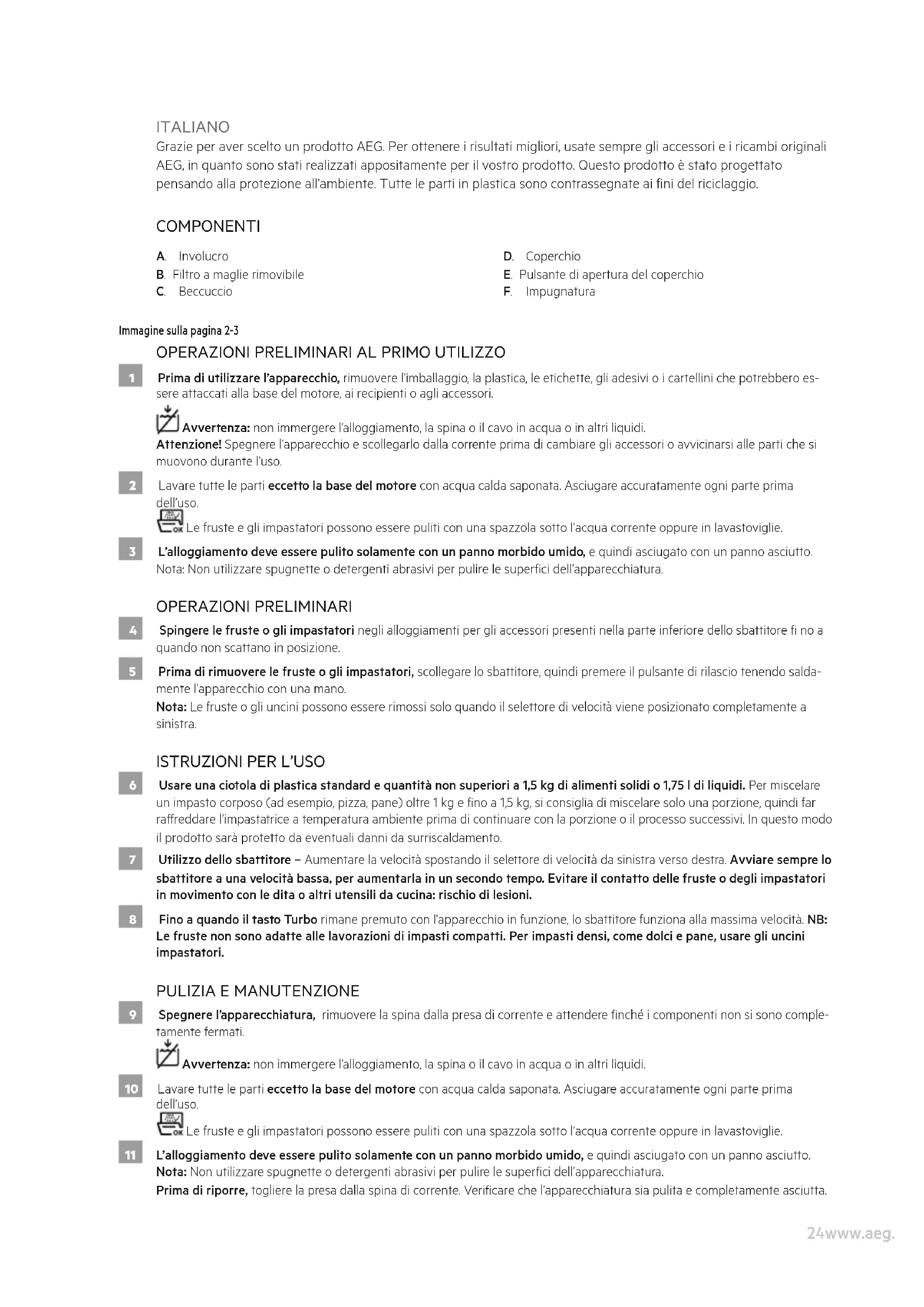 9 Spegnere l’apparecchiatura, rimuovere la spina dalla presa di corrente e attendere nché i componenti non si sono comple- tamente fermati. Avvertenza: non immergere l’alloggiamento, la spina o il cavo in acqua o in altri liquidi. 10 Lavare tutte le parti eccetto la base del motore con acqua calda saponata. Asciugare accuratamente ogni parte prima dell’uso. Le fruste e gli impastatori possono essere puliti con una spazzola sotto l’acqua corrente oppure in lavastoviglie. 11 L’alloggiamento deve essere pulito solamente con un panno morbido umido, e quindi asciugato con un panno asciutto. Nota: Non utilizzare spugnette o detergenti abrasivi per pulire le superci dell’apparecchiatura. Prima di riporre, togliere la presa dalla spina di corrente. Vericare che l’apparecchiatura sia pulita e completamente asciutta.25www.aeg.com