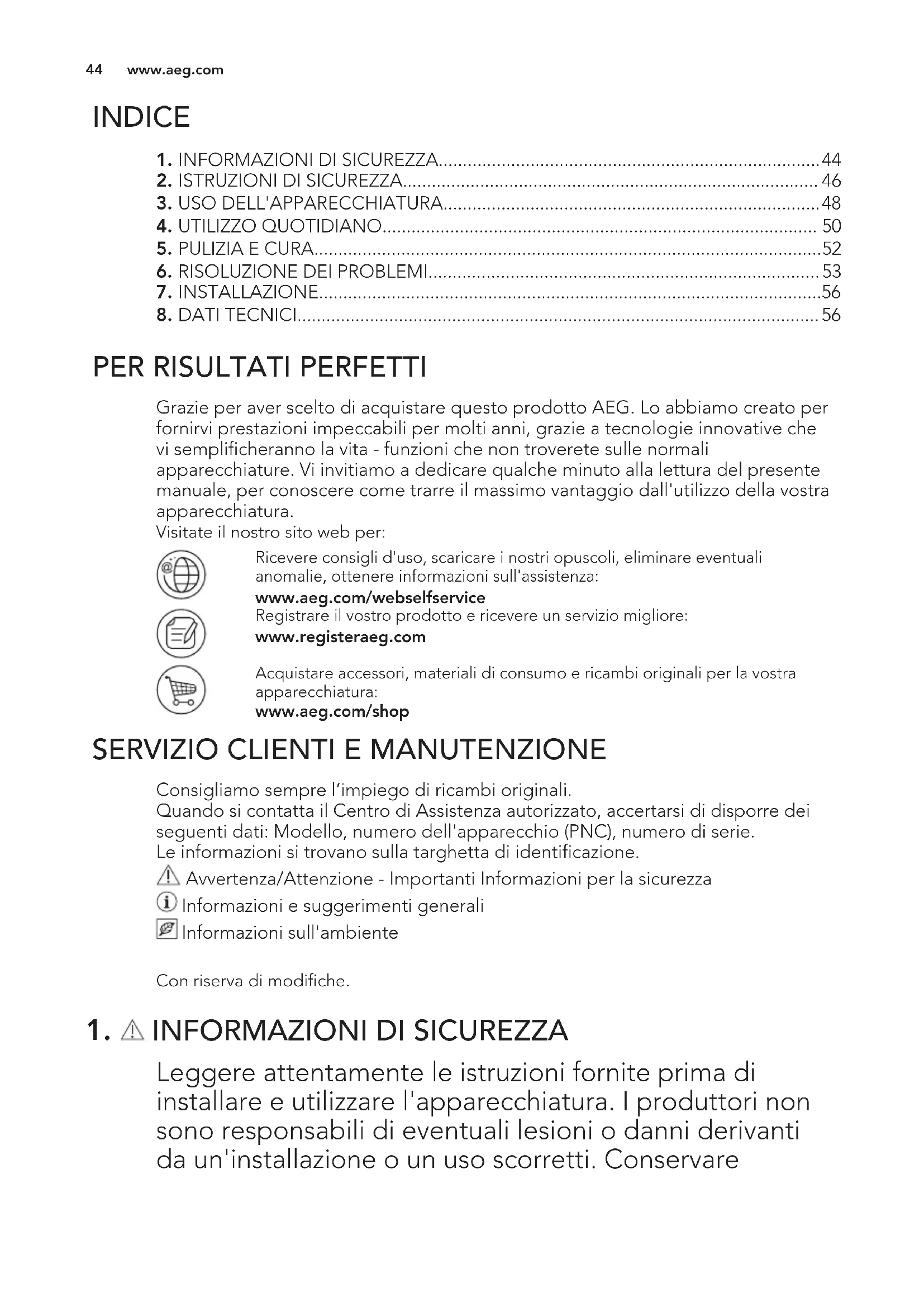 Leggere attentamente le istruzioni fornite prima di installare e utilizzare l'apparecchiatura. I produttori non sono responsabili di eventuali lesioni o danni derivanti da un'installazione o un uso scorretti. Conservare www.aeg.com 44sempre le istruzioni in un luogo sicuro e accessibile per poterle consultare in futuro.