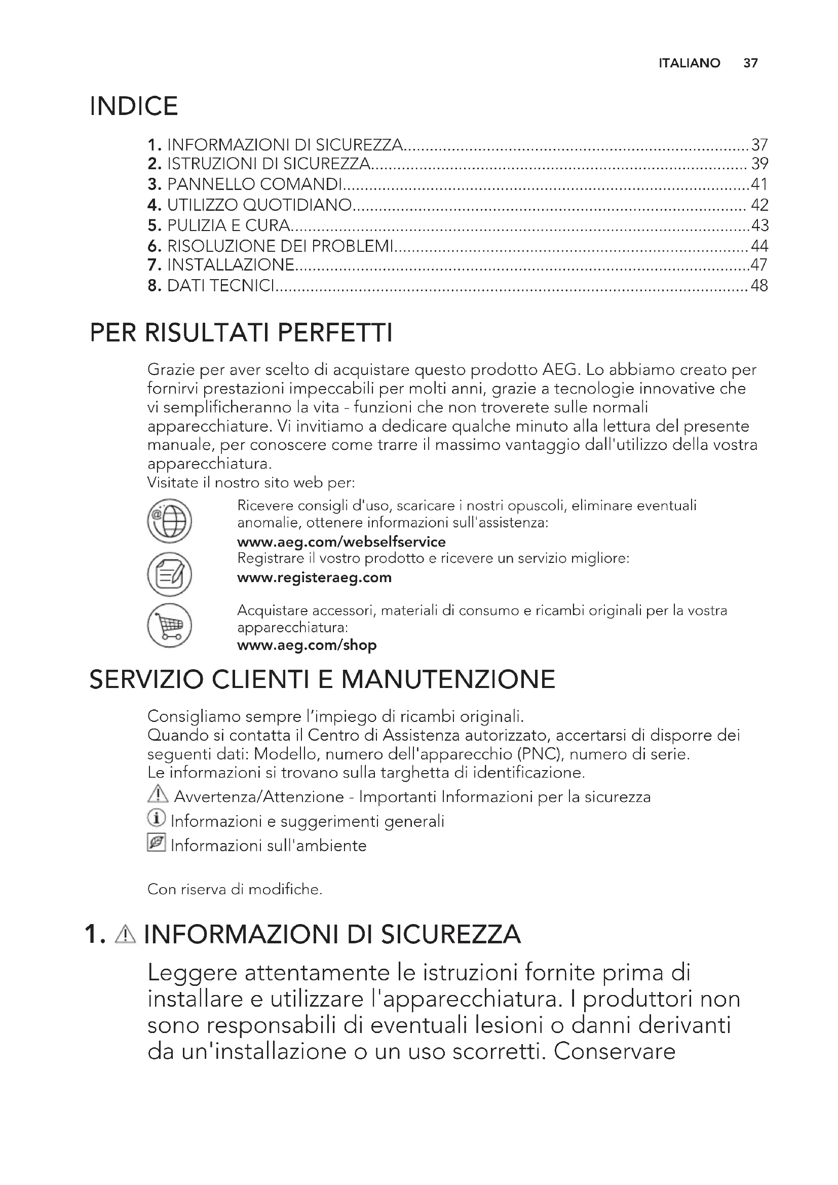 Grazie per aver scelto di acquistare questo prodotto AEG. Lo abbiamo creato per fornirvi prestazioni impeccabili per molti anni, grazie a tecnologie innovative che vi semplificheranno la vita - funzioni che non troverete sulle normali apparecchiature. Vi invitiamo a dedicare qualche minuto alla lettura del presente manuale, per conoscere come trarre il massimo vantaggio dall'utilizzo della vostra apparecchiatura. Visitate il nostro sito web per: Ricevere consigli d'uso, scaricare i nostri opuscoli, eliminare eventuali anomalie, ottenere informazioni sull'assistenza: www.aeg.com/webselfservice Registrare il vostro prodotto e ricevere un servizio migliore: www.registeraeg.com Acquistare accessori, materiali di consumo e ricambi originali per la vostra apparecchiatura: www.aeg.com/shop