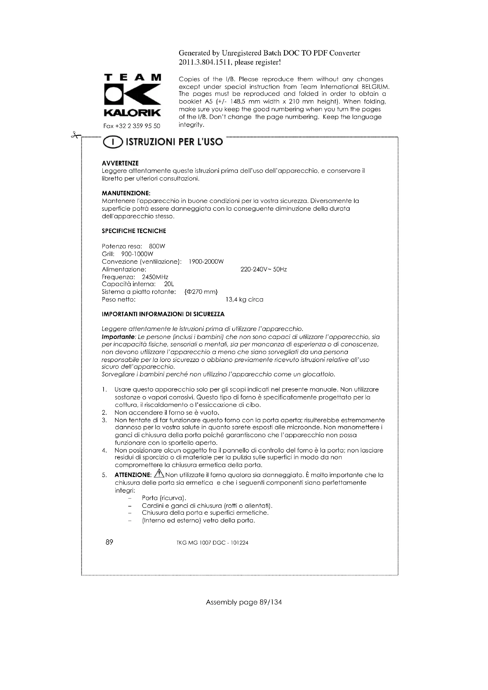 Per il dettaglio di ogni voce, prego voler far riferimento al paragrafo “FUNZIONAMENTO”. Schermo: Indica il tempo di cottura, la potenza, l‟ora e lo stato delle differenti programmazioni e regolazioni. Micro Power: Attiva la funzione microonde e permette di regolare la potenza (5 diversi livelli). Grill.Combi/Conv.Combi: Usare queso tasto per impostare la modalità convezione (ventilazione), la funzione grill o la funzione combinata. Auto cook: Permette di impostare un programma di cottura automatico. Preset.Clock: Permette di regolare l‟orologio o di programmare l‟accensione del microonde. Instant.Start: Per l‟accensione del forno o per riatttivare la cottura quando si interrompa. Stop.Clear: Premere una volta durante la fase di immissione di comandi per cancellare le impostazioni correnti; premere una volta durante la cottura per bloccare il funzionamento del forno o premere due volte per cancellare il programma di cottura. Manopola: Permette di regolare i tempi di cottura, la potenza, il peso e l‟ora.Generated by Unregistered Batch DOC TO PDF Converter 2011.3.804.1511, please register! Copies of the I/B. Please reproduce them without any changes except under special instruction from Team International BELGIUM. The pages must be reproduced and folded in order to obtain a booklet A5 (+/- 148.5 mm width x 210 mm height). When folding, make sure you keep the good numbering when you turn the pages of the I/B. Don‟t change the page numbering. Keep the language integrity.