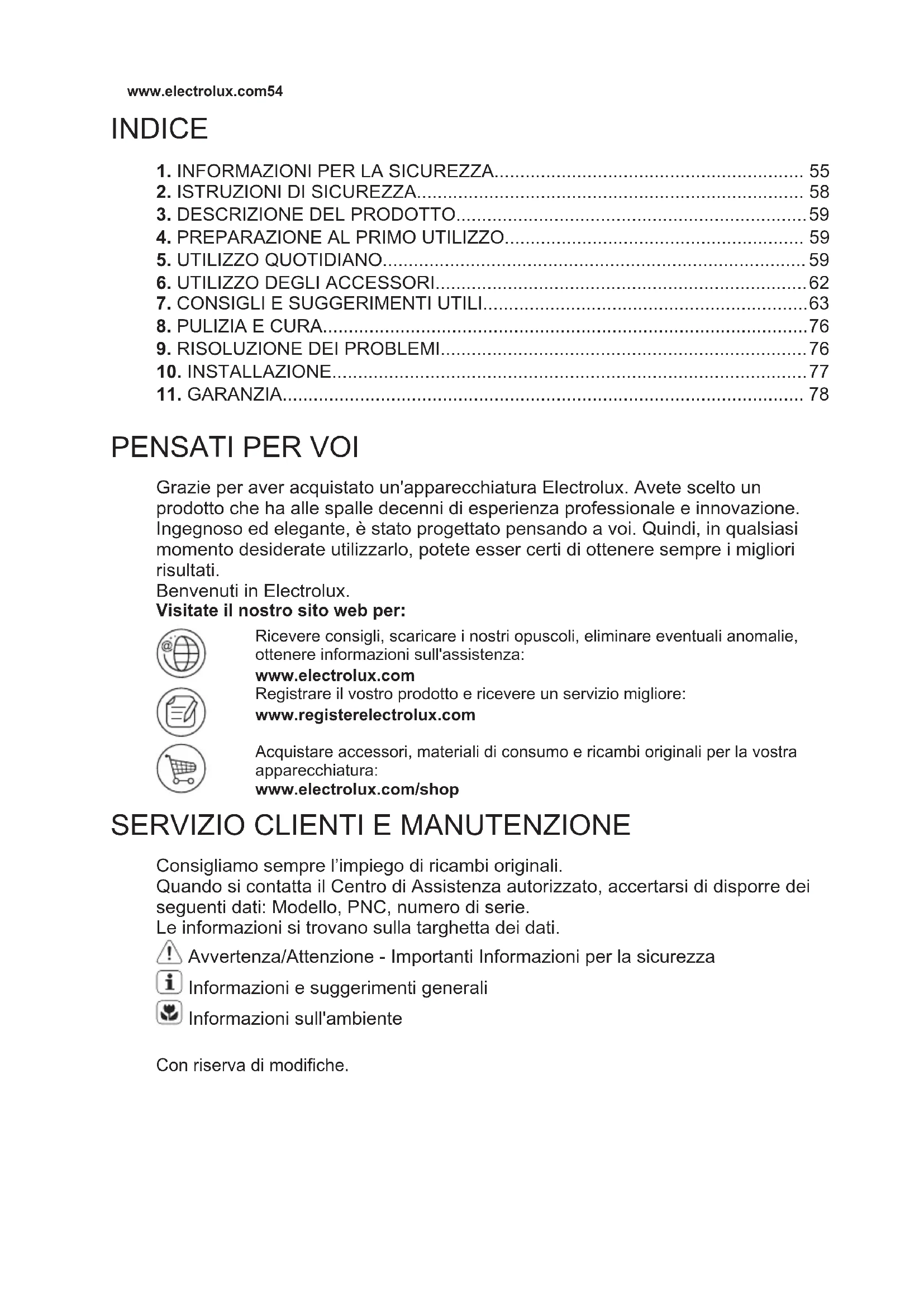 Grazie per aver acquistato un'apparecchiatura Electrolux. Avete scelto un prodotto che ha alle spalle decenni di esperienza professionale e innovazione. Ingegnoso ed elegante, è stato progettato pensando a voi. Quindi, in qualsiasi momento desiderate utilizzarlo, potete esser certi di ottenere sempre i migliori risultati. Benvenuti in Electrolux. Visitate il nostro sito web per: Ricevere consigli, scaricare i nostri opuscoli, eliminare eventuali anomalie, ottenere informazioni sull'assistenza: www.electrolux.com Registrare il vostro prodotto e ricevere un servizio migliore: www.registerelectrolux.com Acquistare accessori, materiali di consumo e ricambi originali per la vostra apparecchiatura: www.electrolux.com/shop