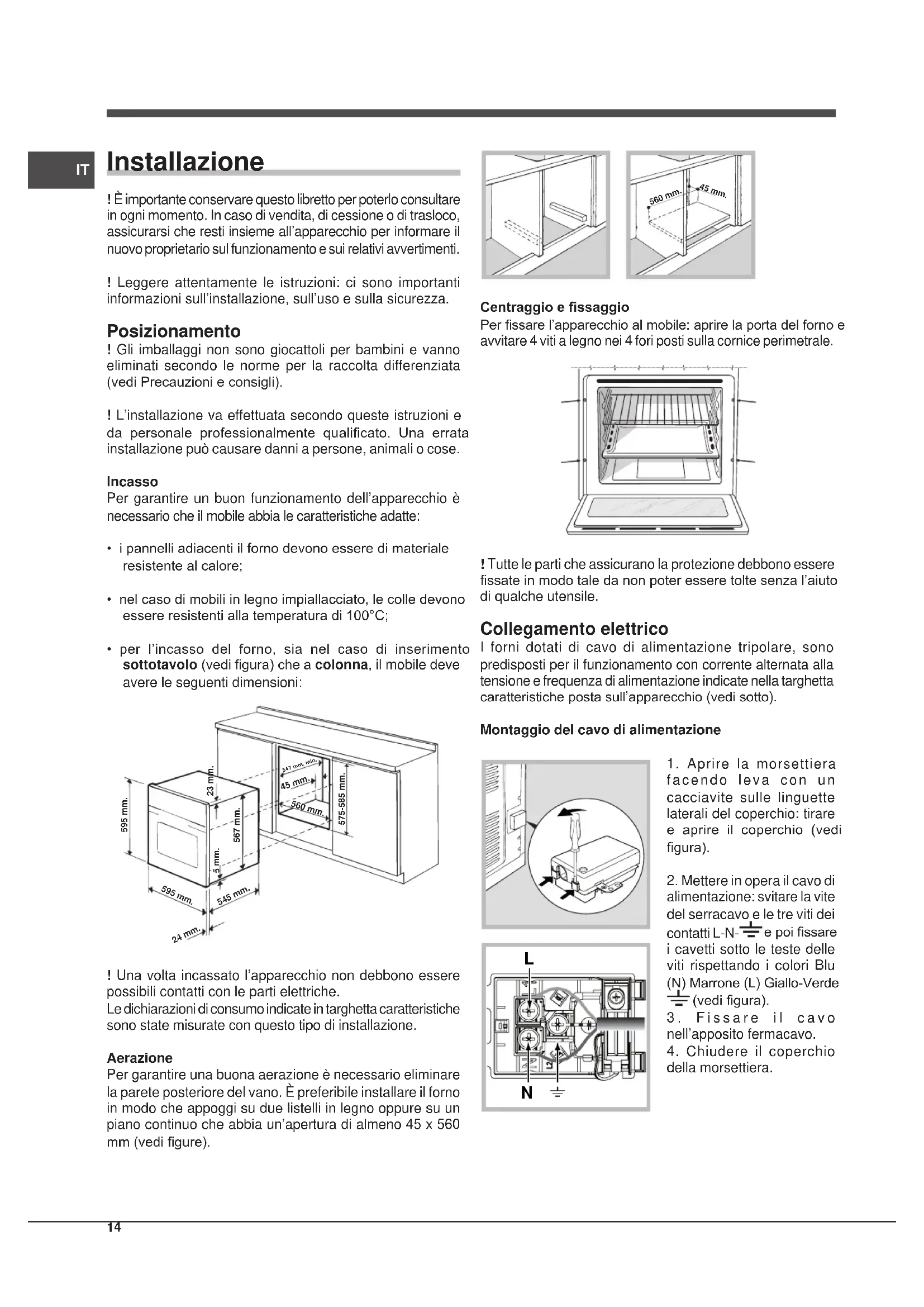 - per l’incasso del forno, sia nel caso di inserimento sottotavolo (vedi gura) che a colonna, il mobile deve avere le seguenti dimensioni: 595 mm. 595 mm.24 mm.545 mm.5 mm.567 mm.23 mm.575-585 mm.45 mm.560 mm. 547 mm. min. ! Una volta incassato l’apparecchio non debbono essere possibili contatti con le parti elettriche. Le dichiarazioni di consumo indicate in targhetta caratteristiche sono state misurate con questo tipo di installazione. Aerazione Per garantire una buona aerazione è necessario eliminare la parete posteriore del vano. È preferibile installare il forno in modo che appoggi su due listelli in legno oppure su un piano continuo che abbia un’apertura di almeno 45 x 560 mm (vedi gure). 560 mm. 45 mm. Centraggio e ssaggio Per ssare l’apparecchio al mobile: aprire la porta del forno e avvitare 4 viti a legno nei 4 fori posti sulla cornice perimetrale. ! Tutte le parti che assicurano la protezione debbono essere ssate in modo tale da non poter essere tolte senza l’aiuto di qualche utensile. Collegamento elettrico I forni dotati di cavo di alimentazione tripolare, sono predisposti per il funzionamento con corrente alternata alla tensione e frequenza di alimentazione indicate nella targhetta caratteristiche posta sull’apparecchio (vedi sotto). Montaggio del cavo di alimentazione