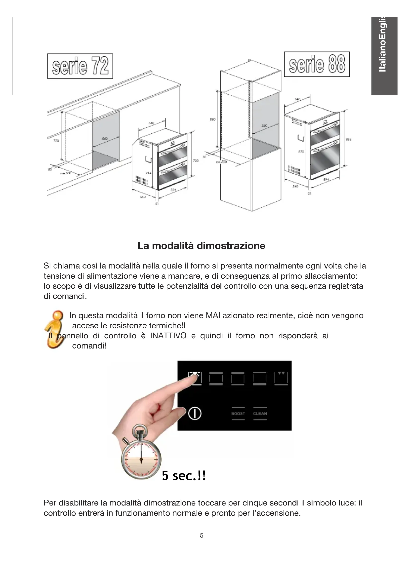 La modalità dimostrazione Si chiama così la modalità nella quale il forno si presenta normalmente ogni volta che la tensione di alimentazione viene a mancare, e di conseguenza al primo allacciamento: lo scopo è di visualizzare tutte le potenzialità del controllo con una sequenza registrata di comandi. In questa modalità il forno non viene MAI azionato realmente, cioè non vengono accese le resistenze termiche!! Il pannello di controllo è INATTIVO e quindi il forno non risponderà ai comandi! 5 sec.!! Per disabilitare la modalità dimostrazione toccare per cinque secondi il simbolo luce: il controllo entrerà in funzionamento normale e pronto per l’accensione.ItalianoEnglishFrançaisDeutschEspañolNederlandsPortuguês